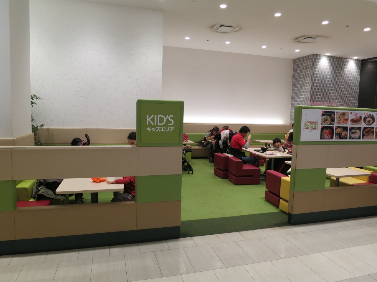 フードコートの隅には、キッズコーナーがあり、低いテーブルといすが用意されています。ここで食べましたが、小さな子どもでも足が着き、まわりにも小さなお子さんが多くて、娘はよく食べたような気がします。- 旅行時期