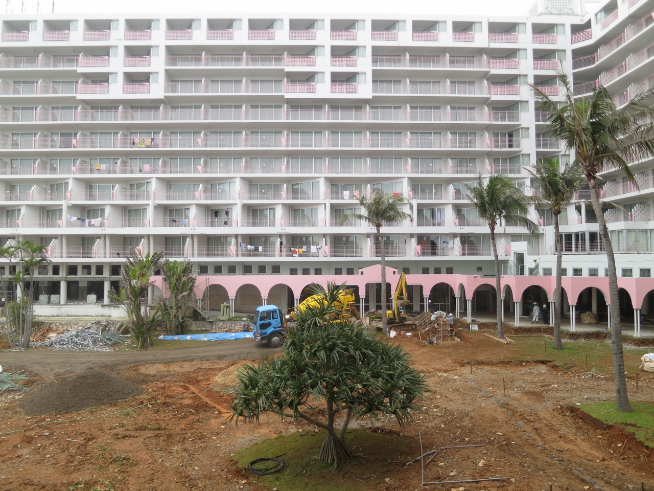 玄関、ロビー、中庭(屋外プール含む)、レストランなどホテルの1階部分を改修工事中に4泊しました。屋外プールは営業中止、屋内プールは通常営業、レストランは閉鎖のため、隣接する「やんばる海の駅(2階てぃんがーら)」での対応になっていました。工事時間は、9時から17時で、昼間はかなりにぎやかな工事の音がしていました。工事のため、1階の廊下も狭くなっており、雨の日には混み合う通路が濡れて滑りやすく危険でした。乳児&幼児連れだったので、隣接する朝食会場まで行くのが雨の日は大変(近いが一旦外に出る)、2階まではエレベーターがなく、バギーでは直接朝食会場まで行けないのも不便でした。お手頃な宿で、海洋博公園まで近く、お部屋は和洋室で広く、ゆったり過ごせてよかったけれど、また泊まるならリニューアル後に考えたいと思います。