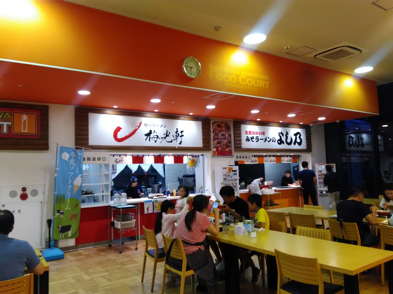 北海道を家族で旅行中、情報集めと夕食を食べに、18時頃寄りました。フードコートはお食事するグループもいるけれど、空いていて、私は「ごはん処あさひ屋」の「豚肉のスタミナ焼き定食」、夫は「旭川ラーメン梅光軒」の「うま辛ラー油麺」、子どもたちは「みそラーメンのよし乃」の「大盛りみそラーメン」をいただいました。ラーメンを食べたいという子どもたちのリクエストで、味噌ラーメンにしたけれど、こちらのラーメンとっても辛く、子どもたちには大失敗でした。食券購入前に確認をするべきだった・・・。豚肉のスタミナ焼き定食は、旅行中で定食に飢えていたのもあり、美味しかったです。私は子ども用の味噌ラーメンもいただき、子どもたちは豚肉のスタミナ焼き定食を食べたりしました。