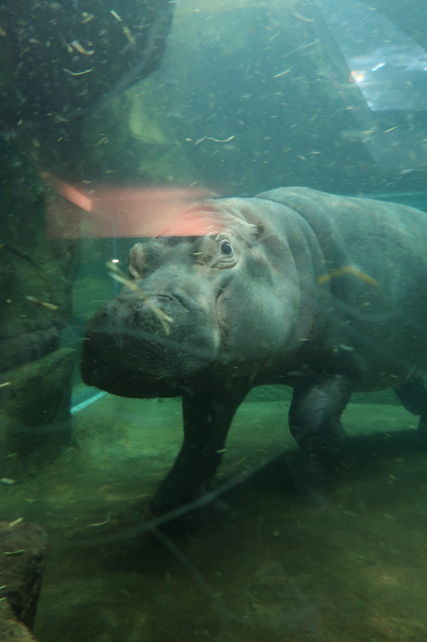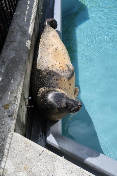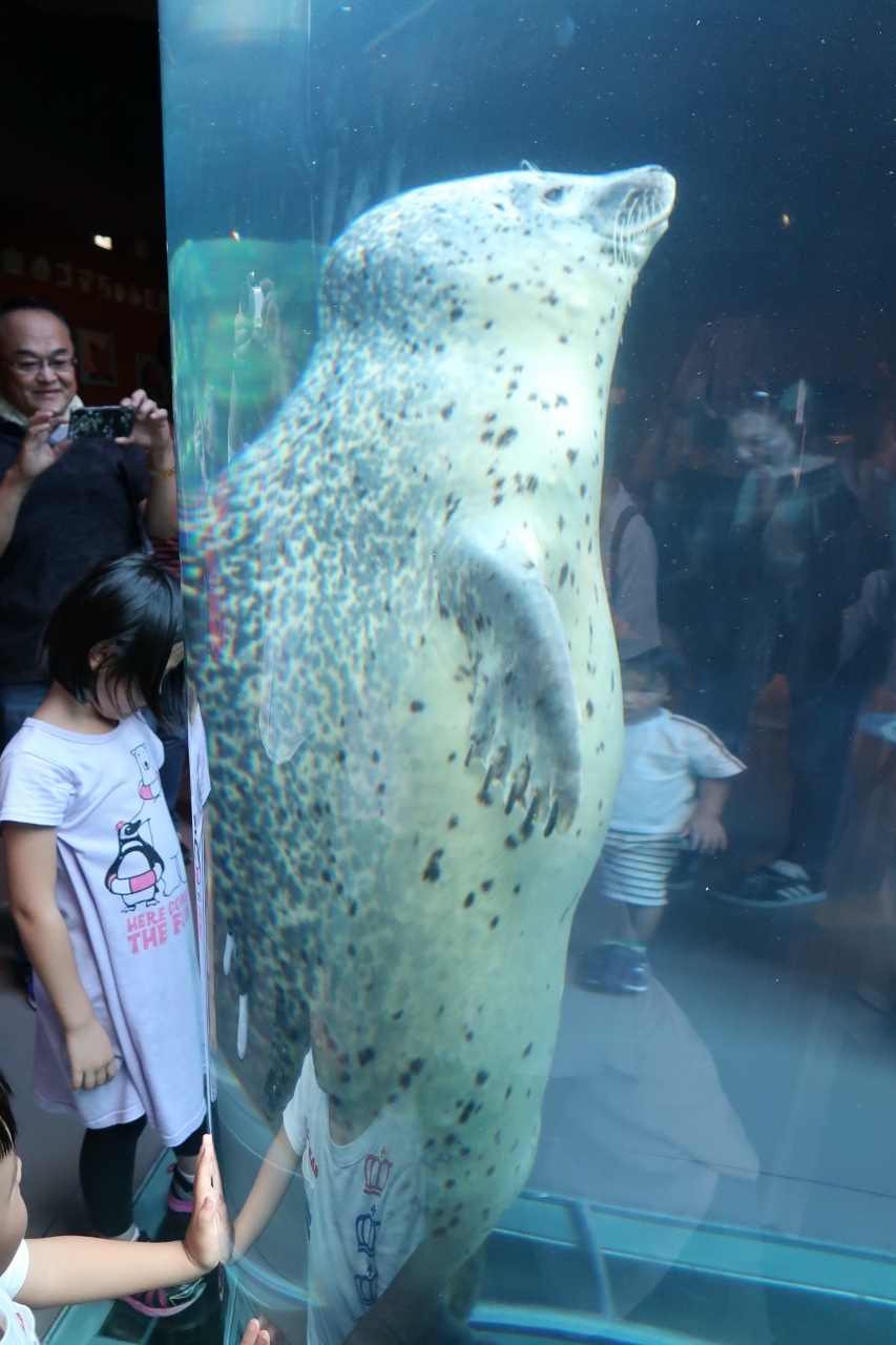 夏休みに北海道を家族で旅行中の北海道旅行6日目、開園時間9:30から旭山動物園に行きました。あざらし館には、行動展示の「マリンウェイ(円柱水槽)」があり、旭山動物園の人気の施設の1つのようでした。マリンウェイの周りは、混んでいたけれど、アザラシが何度も上へ行ったり、下へ行ったりするアザラシ特有の垂直の泳ぎを見ることが出来ました。子どもたちは、間近でアザラシが泳ぐ姿が見られて、すごく喜んでいました。他の動物で、楽しみにしていた行動展示の場所に動物が来ない(いない)ことが多かったので、アザラシのマリンウェイを泳ぐ姿は、旭山動物園の印象的なシーンの1つになりました。