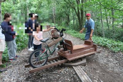 家族で十勝を旅行中に、家族で乗りに行きました。三の沢駐車場の横に乗り場があり、回転台のレクチャーなどを5分ほど受けてから、4台で一緒に出発しました。1台に自転車を漕ぐ人(1人)と乗る人(1~2人)の2~3人が乗ることが出来ます。この足漕ぎトロッコは、廃線となった国鉄士幌線を手作りで復活させたものだそうです。足こぎの負担はなく、6歳の娘でも往復漕いで、親+兄弟を乗せることが出来ました。森の中をサイクリングで疾走したような感じで、気分爽快、最高の森林浴スポットでした。