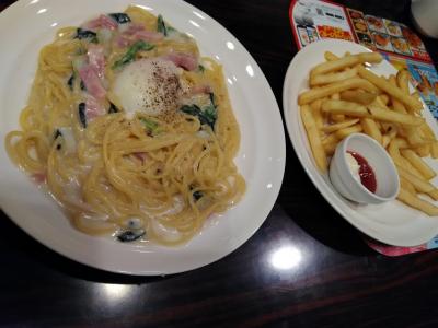 夏休みに北海道を家族で旅行中、北竜町から札幌市へ向かう途中、こちらで夕食を食べました。旅行6日目で、子どもたちがドリンクバーのあるレストランに行きたいということで、たまにはファミレスもいいなぁと思い、近くにあったガストに寄りました。20時頃着くと、店内は満席に近い状況でした。家族それぞれ食べたいもの「山盛りポテト」「カルボナーラ大盛り」「肉盛り!ワイルドプレートガーリックソース」「低糖質タン麺」とドリンクバーを頼み、いただきました。ファミレスは、家族みんなが食べたいものがあって、子どもたちの大好きなドリンクバーがあって、旅行中も大活躍でした。