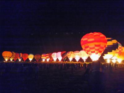 初日は朝から生憎の雨で、午前(5:30~)のタスクフライトは中止となったので、十勝の他の場所へ観光に出掛け、夜19:30からの納涼花火大会を見に行きました。花火の上がる合間に、浮かんだ熱気球がバーナーを焚いて、明るく光り、花火とのコラボがとてもきれいでした。