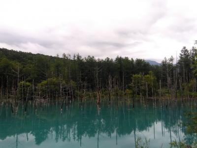 北海道を家族で旅行中、9時頃行きました。すでに駐車場はいっぱいの人で、青い池も沢山の観光客で混雑していました。上流の白金温泉地区で湧出している「白ひげの滝」などからアルミニウムを含んだ水が、美瑛川の水と混ざって、コロイドが生成され、太陽光が水中のコロイド粒子と衝突して、波長の短い青い光が散乱されるため、青く見えるらしいです。訪れたときは曇りでしたが、場所に寄って、いろいろな青さがあり、奥の方が水の青さに深みがあって、きれいに見えました。青い池に立ち枯れのカラマツが幻想的な景色を作り出していました。