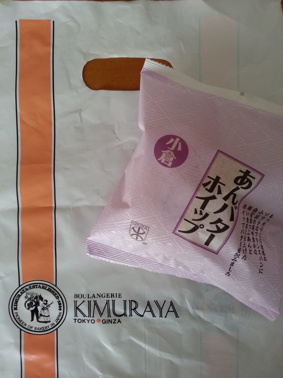 大丸東京店でお買い物後、充実のスイーツを見ていたら、木村屋總本店を発見し、久しぶりに食べたくなった大好物の「あんバターホイップ(小倉)」を購入しました。ソフトフランスパンにつぶあんとホイップバターが入ったこのパンは、絶妙に美味しく、私の大好きなパンです。木村屋總本店には有名なパンが他にあるけれど、このパンもオススメです。