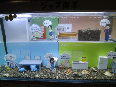 春休みに、上京した母と親子3世代で東京スカイツリータウンに行き、朝は雨が降っていたので、まず「すみだ水族館」に入りました。10時前でしたが、春休みの週末のせいか、すでに沢山の人でにぎわっていました(観賞出来ないほどではなく、動きづらいくらい)。開館して5年と新しい水族館は、水槽1つ1つがとってもきれいで、清掃も行き届いていて、感動的でした。一番の見所と思われる、ペンギンの屋内プールは、広くて、上から、下から、横から眺めることが出来、子どもたちは開放的なこのエリアがとても気に入ったようでした。ちょうど「ZIP朝だよ!貝社員」とのコラボ企画が行われていて、桝アナの貝講座や貝社員名場面集を上映していたり、コラボ水槽が沢山あって、子どもたちはよく見ていました。ペンギンカフェでソフトクリームを食べて一休みし、2時間ほどいました。