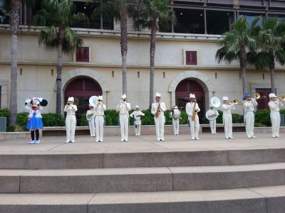 開園直後のメインエントランス付近を歩いていたら、マリタイムバンド&ミッキー・ミニーに会いました。先を急ぐ人も多い中、子供たちと素敵な演奏とミッキー&ミニーを堪能しました。入園してすぐにミッキー&ミニーにも会えて、とってもラッキーでした。