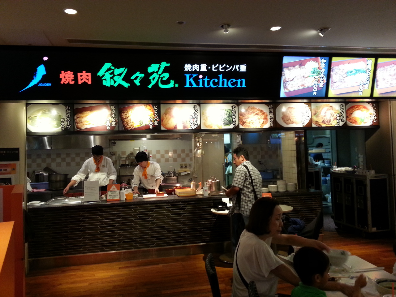 3連休のランチ時に親戚10人ほど(子ども含む)で品川キッチンに行きました。フードコートは大変混んでいて、空席はなく、しばらく待って席を見つけました。フードコート内には、叙々苑キッチンとひるがおEX(ラーメン店)、楽甚(お好み焼き・鉄板焼き・たこ焼き)、うどん屋さん、ピザ&パスタ屋さん、カレー屋さん、カフェ&バーがありました。ひるがおEXの塩玉つけ麺、ミニ肉ご飯、醤油白湯らーめん、焼き餃子や、叙々苑キッチンの和牛カルビ重、焼肉ビビンバ重、楽甚のたこ焼きなど、それぞれが食べたいものを購入し、いただきました。どのお店も食券を購入して注文後15~20分ほどで出来上がり、取りに行きました。カフェ&バーでビールも購入し、ゆっくりランチをいただきました。品プリのフードコートだけあって、他のフードコートより価格帯が高め(¥1000くらい)ですが、品プリ内のレストランより全然安く、どれも美味しかったです。子どもたちもよく食べました。食事券の半券が¥5000以上あれば、駐車場が3時間無料になります。