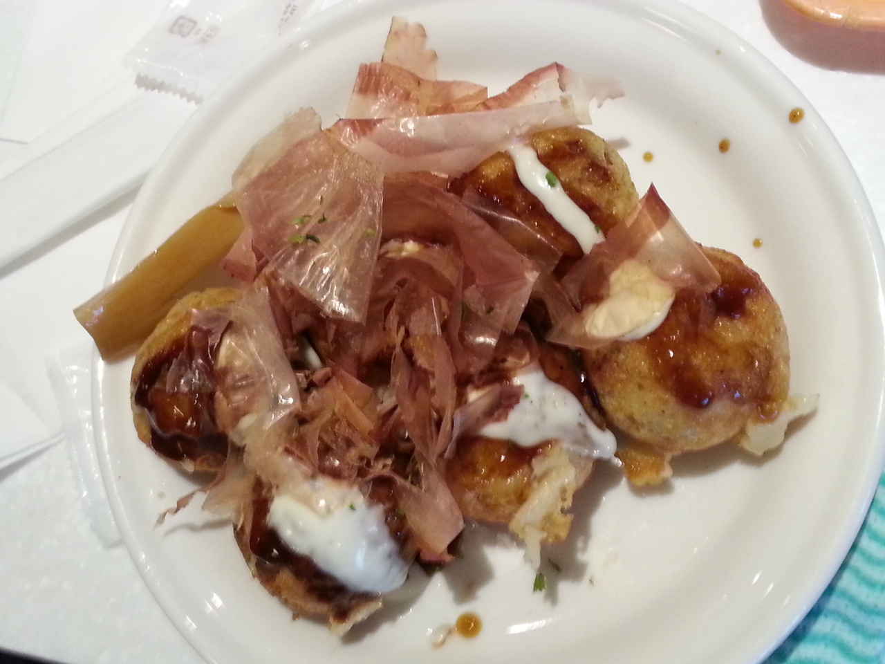 3連休のランチ時に親戚10人ほど(子ども含む)で品川キッチン(品プリの中にあるフードコート)に行き、こちらのたこ焼き(6個入り)¥600をいただきました。フードコートは大変混んでいて、楽甚は食券を購入して注文後20分少し待って、受け取りに行きました。大きめのたこ焼きの中には、タコの他に味つきのこんにゃくも入っていて、ビックリしました。お味は普通でしたが、出来立てのたこ焼きは子どもたちに人気でした。