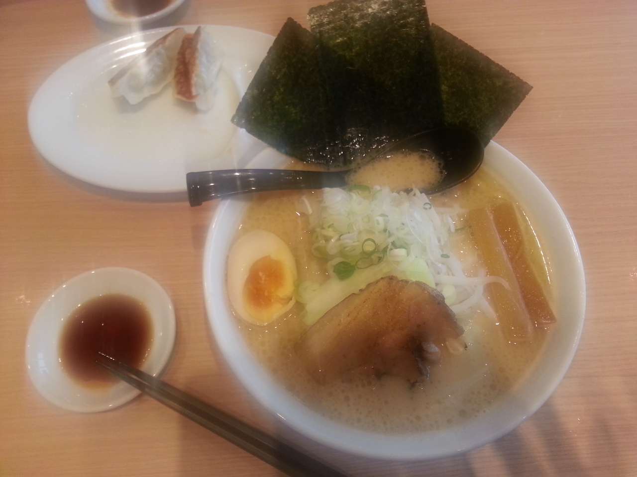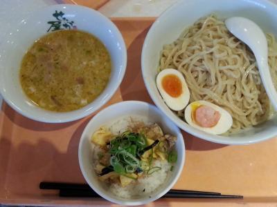 イオン東久留米店に買い物に行った際、こちらでランチを食べました。平日のお昼時で、お店はそんなに混んでなかったです。つけ麺好きの主人はつけ麺(山盛り・麺増量無料)¥830を、私は平日限定の春樹お得セットから濃厚とんこつ醤油ラーメン¥720、餃子セット+¥180を頼みました。久し振りのラーメン屋さんのラーメンでしたが、スープが口当たりよく美味しくて、具沢山豪華で、ボリュームもあり、大満足でした。焼きたての餃子も美味しかったです。