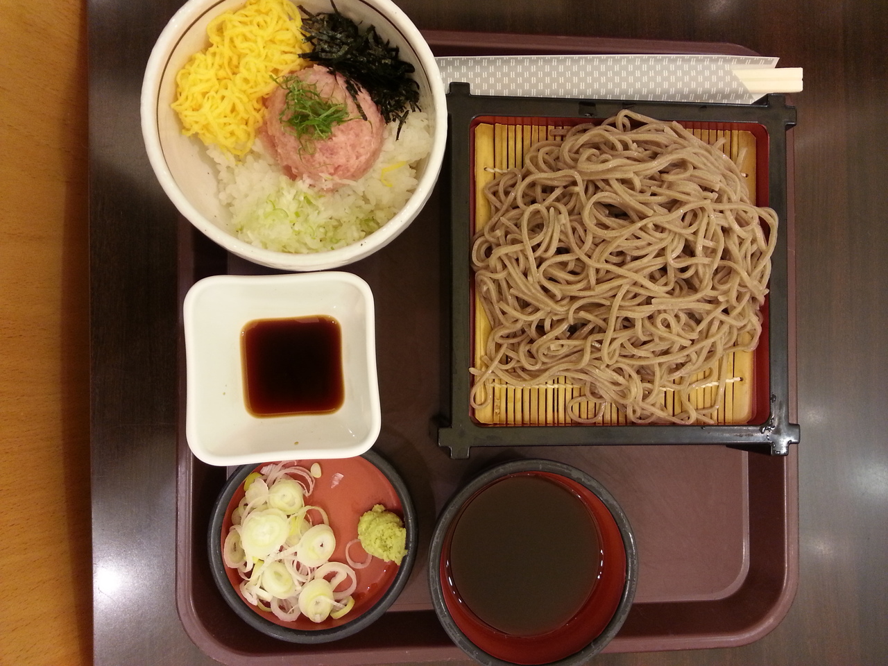羽田空港第一ターミナルのフードコート「シェフズキッチン」にある日本そばのお店です。休日の夕方羽田空港に到着したので、フードコートで軽く夕食を食べて帰りました。娘のおそばが食べたいというリクエストで、こちらの「ネギトロ丼とそば¥860」を購入(おそばは温か冷か選べます)。普通のザルそばとネギトロ丼でしたが、おそばもネギトロ丼も大好きな娘は大喜びで、ほとんど一人で食べました。