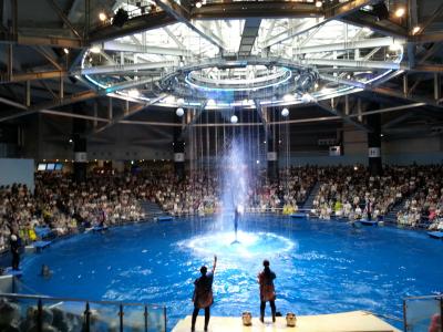 3連休(SW)のなか日に、お誕生日の娘のリクエストで、家族で行きました。3連休のなか日で、雨だったこともあり、屋内施設の水族館は劇的に混んでいました。お昼過ぎに到着し、フードコートでランチを食べた後に行きましたが、入場券購入にも列が出来ていました。10分ほど並んでチケットを購入、0・3・6歳連れでこんなに混んでいるところに行って大丈夫かと心配になるほどでした。14:30からのショーは、入場してまもなくで、始まる前にスタジアムに行きましたが、すごい人で、見えそうな場所はどこもありませんでした。ショーの間に水族館を見、ショーが終わり次第、スタジアムに行き、16時からのショーを待つことにしました。終わり次第スタジアムに入ったけれど、上の方の席はすでにいっぱいで、下の方の席はずぶ濡れになるとのことで(ポンチョを買う必要あり)、立ってみることにし、子どもたちと立って次のショーを待ちました。運よく、15:15から臨時でショーが行われるということで、ぐずる子どもたちをなだめて待ち、ショーを見ました。ショーが始まると、大音量の音楽と、イルカとクジラのパフォーマンスに圧倒されて、子どもたちはぐずることもなく、集中して見ていました。凄い人で、子どもたちも疲れたようだったので、早めに水族館を後にしました。ベビーカーで来ている人もいましたが、すごい人で、身動きがとれず、大変だったと思います。ベビーカーは入口において行けるようにもなっていました(この日は0歳の長男は抱っこで行っていました)。リニューアルして大人のデートにも最適な素敵な水族館になっていますが、混んでいる日はよく見たい人や子連れは避けた方がよいと思います。行くなら、ショーは次の回を待ってでも、絶対に見たほうがいいです。