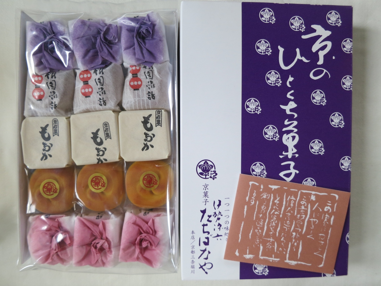 宝永5(1708)年創業の老舗京菓子店です。『京のひとくち菓子』を、親戚から京都土産にいただきました。5種類のひとくちサイズの最中やお饅頭、餅菓子が3個ずつ入った和菓子の詰め合わせで、お茶とともにいろいろな味を楽しめました。子どもたちと一緒にいただきましたが、ひとくちサイズなので、子どもたちも食べやすく、いつもは何個も食べられない子どもたちも、楽しそうに選んでは何個もいただいていました。いろいろ入って、サイズも小さく、食べ比べが楽しい和菓子でした。賞味期限も比較的長いので、手土産に重宝すると思います。