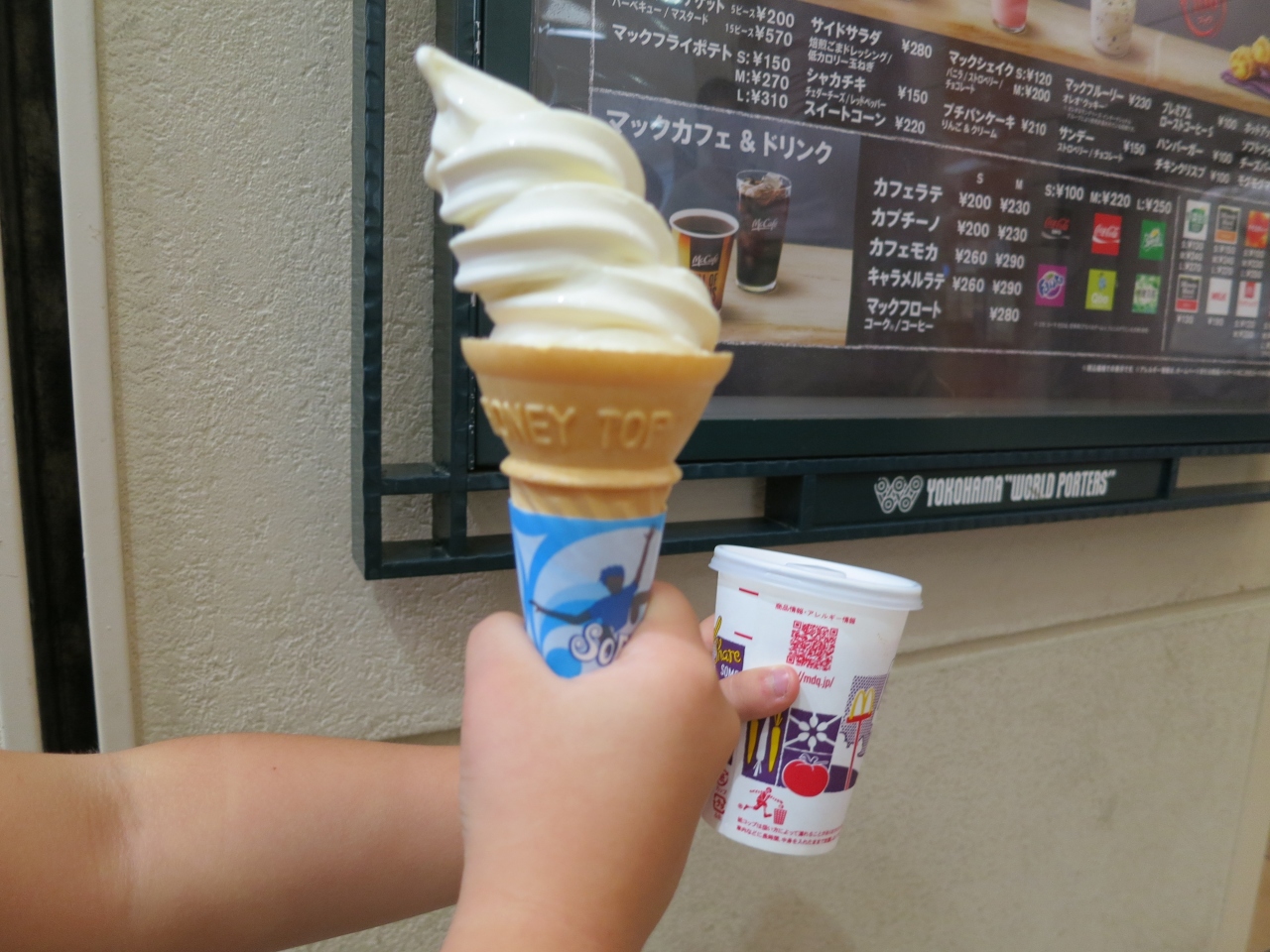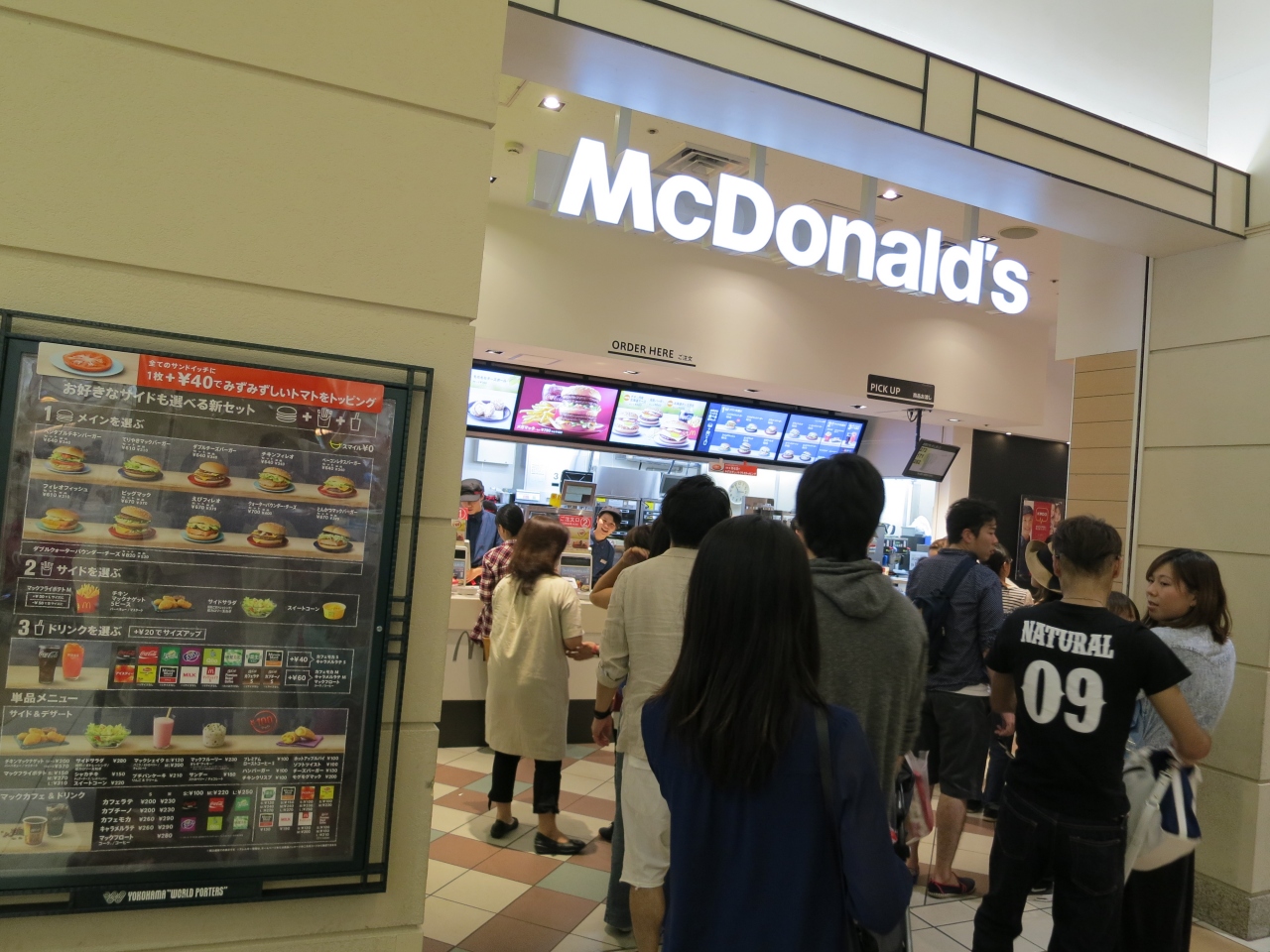 家族で横浜ワールドポーターズに行った際、おやつ時に利用しました。横浜ワールドポーターズ1Fの汽車道側正面入り口横にあり、いつでも混んでいるマックです。お買い物の休憩にこちらで、娘は大好物の「ソフトツイスト」¥100を、私は期間限定の「マックシェイク(紫いも)」¥100を購入し、外のベンチに座っていただきました。以前行った際はなかった電光掲示板が導入され、注文した後、電光掲示板に自分の番号が出たら受け取りに行くようになっていました。簡単な注文だったので、10分弱ほどで受け取ることが出来ましたが、かなり混んでいて、沢山の人が待っていました。期間限定の「マックシェイク(紫いも)」は、いも好きの私は、すっかりはまっていて、販売期間中、機会がある度に購入するほど飲んでいます。紫いもの甘いシェイクが、歩き疲れた体に染み渡り、すっかりリフレッシュでしました。