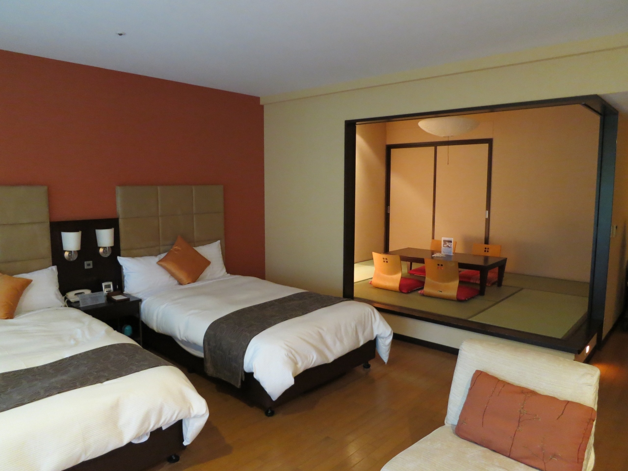 8月の週末にお友達家族とスタンダード和洋室タイプに1泊(素泊まり)しました。客室は2号棟の1階、中庭側でした。お部屋は家族4人でも快適な広さで、ダブルベッドが2つに、ソファー(ベッドとしても使用可)、和室、中庭に続くテラスがありました。室内では無料Wifiが使えて、とても便利でした。宿泊者は無料で使用出来るプールや、露天風呂付きの広くて快適なお風呂、足湯のある緑の美しい中庭、ライブラリーなどあり、施設はきれいで新しく、大満足の滞在となりました。