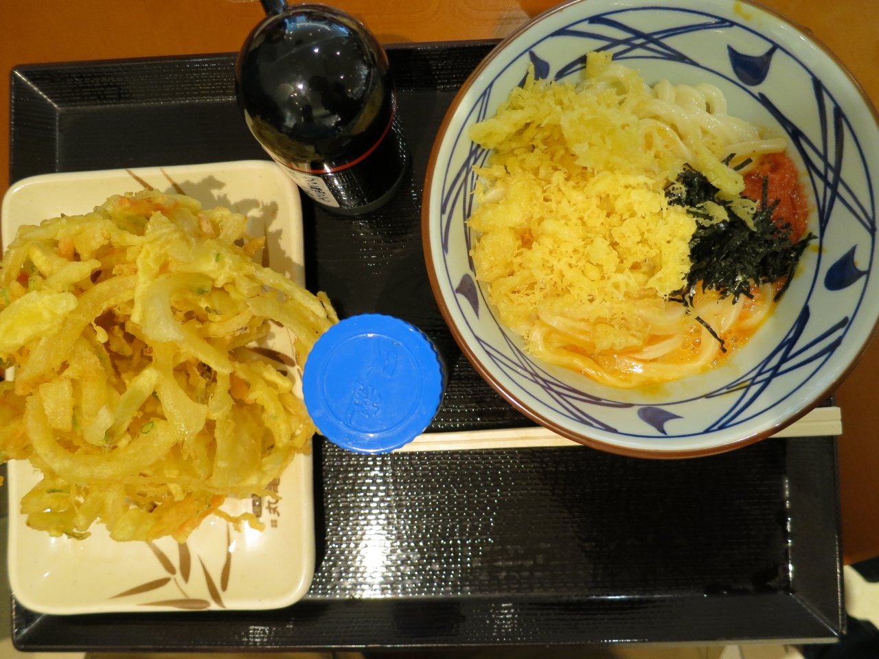 マークイズみなとみらい4F「みんなのフードコート」にある釜揚げ讃岐うどんのお店です。家族でマークイズみなとみらいに行った際のランチ時にこちらの、「明太釜玉(大)」¥500と「野菜かき揚げ」¥130をいただきました。休日のランチ時で、フードコートは席を見つけるのが大変なくらい混み、こちらのお店では15分ほど待って注文しました。もちもちの釜揚げうどんに、明太子と卵が良く絡み、とっても濃厚で美味しかったです。子どもたちと一緒にいただきましたが、あっという間になくなりました。ビックサイズで¥130とお得な野菜かき揚げは、子どもたちの大好物で、ちぎっては、パクパク、こちらもすぐになくなりました。いろいろなところにある丸亀製麺。子どもたちもよく食べ、お値段もリーズナブルなので、外食でよく利用する我が家のお気に入りのお店です。