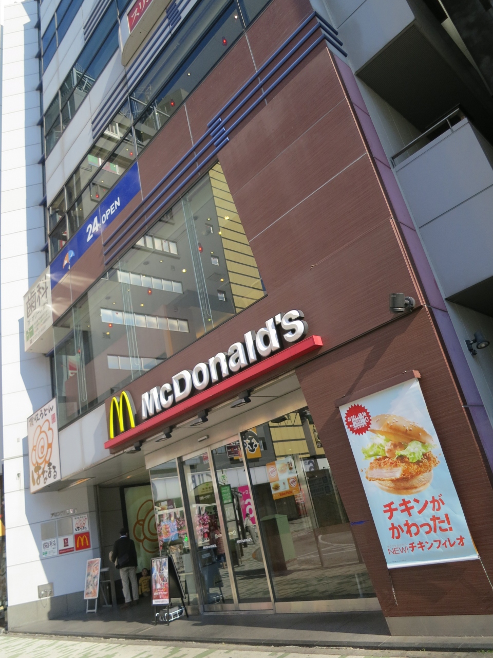 目黒駅を出たところ、バスロータリーの前にある24時間営業のマックです。目黒駅で降車し、バスに乗る前に、お友達のおうちに持って行って、一緒に食べるようにランチを購入しました。休日の午前中でしたが、レジは空いていて、バスが来るまでにお買い物出来ました。この日は、チキンフィレオ、ベーコンレタスバーガー、ハンバーガー2個、チキンクリスプ2個、マックフライポテト、ホットアップル2個、マックシェイク2個などを購入しました。¥100マックが復活して、お財布にやさしく、とってもうれしいです。駅からすぐで、便利なお店です。