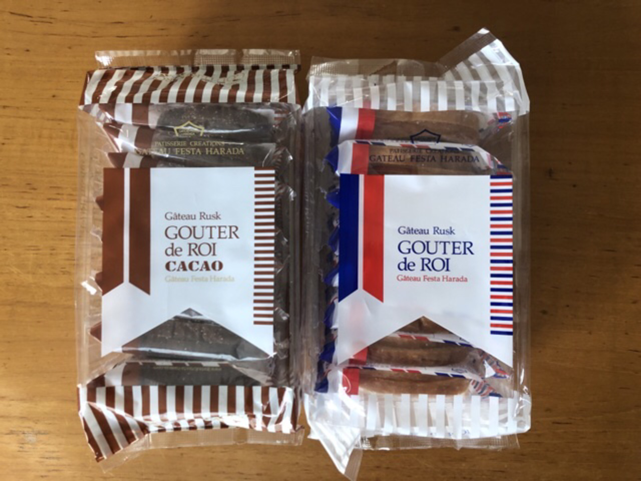 久しぶりに京王百貨店新宿店に行ったので、私も子どもたちも大好きなこちらのお店にも寄りました。定番のガトーラスク「クーテ・デ・ロワ」と、「グーテ・デ・ロワ カカオ」それぞれ8袋入りの小袋を購入しました。「グーテ・デ・ロワ カカオ」は、チョコレートとローストしたカカオ豆を粉砕したカカオニブをフランスパンに練り込みガトーラスクに仕上げたものだそうで、今回初めて購入してみました。おやつに子どもたちといただきましたが、さくさくで、いくつでも食べられる美味しさでした。カカオのラスクは、そんなにチョコレート感は強くなく、でもカカオのラスクが子どもたちに人気でした。
