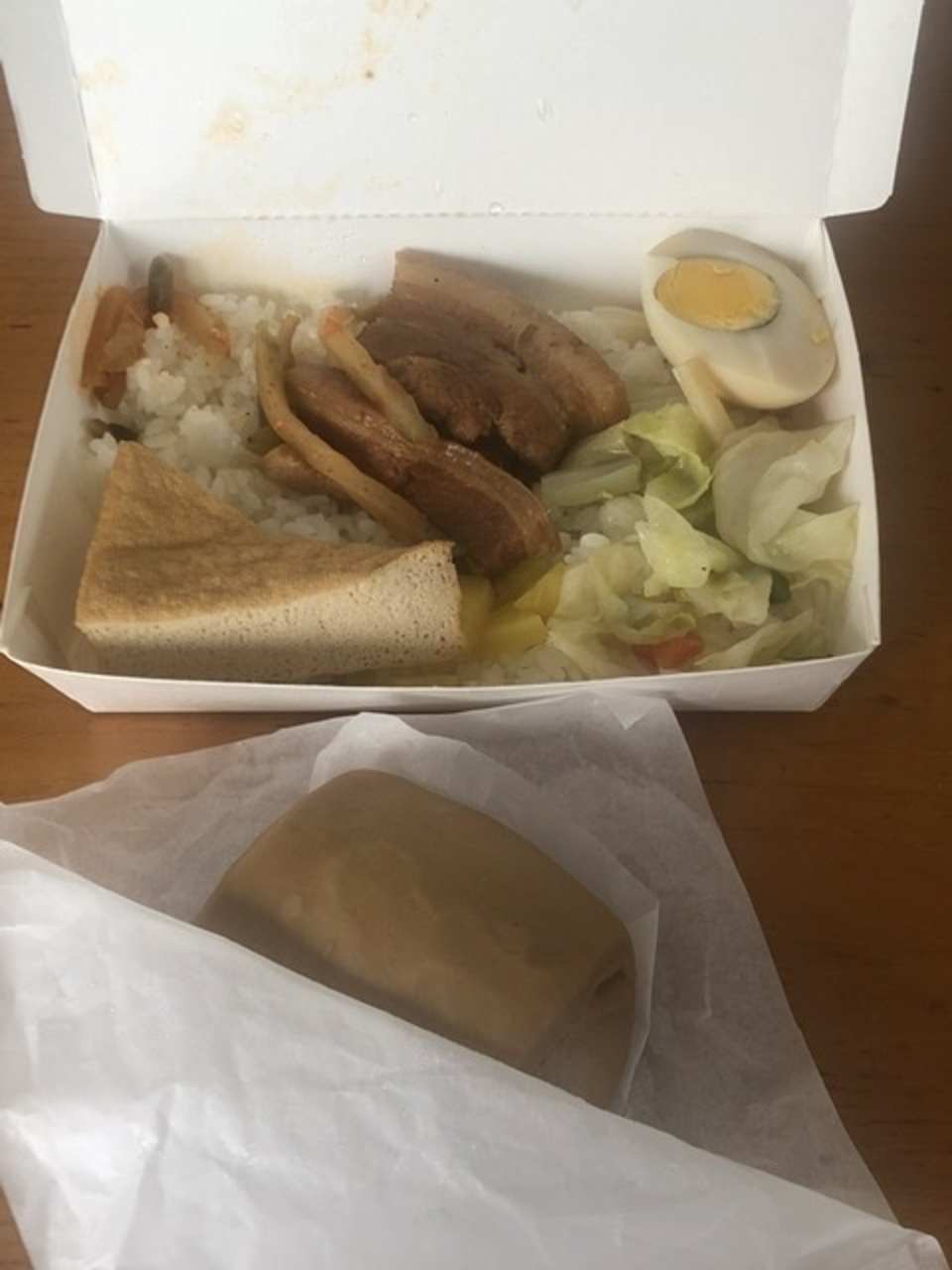 子どもと自転車でこの辺りを走っていたら、行列のあるこちらのお店を発見。台湾夜市屋台めし&ドリンクのお店だそうです。日替わり弁当と迷ったけれど、豚角煮が入った「控肉飯弁当」¥500を購入しました。そしてラインで友達追加すると、饅頭が1つもらえるということで、牛乳饅頭は売り切れだったので、黒糖饅頭¥100をいただきました。お支払は、現金はもちろん、クレカのほか、いろいろな支払方法が選択できて良かったです。帰宅して、一緒に行った息子とお昼にいただきました。息子は黒糖饅頭は苦手なようだったけれど、お弁当が気に入って、美味しいとよく食べました。台湾に行ったことはないけれど、台湾料理ってこんな感じなんだと台湾を感じながらお弁当をいただきました。黒糖饅頭は、やさしく黒糖を感じるしっとり蒸しパンのような感じでした。