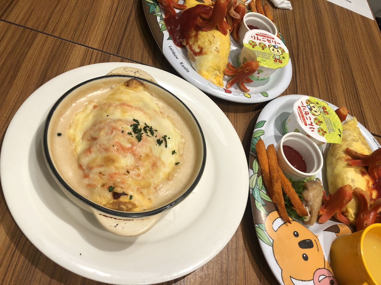娘たちと吉祥寺にお買い物に行った際、こちらでランチをいただきました。私は明太子ドリアに、娘たちはお子様オムライスセットにしました。平日で店内は空いていて、すぐに席に着くことが出来ました。オムライスもドリアも大好きな私には、明太子ドリアのオムライスは最高の組み合わせで、明太子のピリ辛さとホワイトソースのまろやかさが塩梅良く、美味しかったです。お子様オムライスセットは、オムライスにチキン、フライドポテト、たこさんウィンナー、りんごゼリー、オレンジジュースと子どもの大好きなものが詰まったセットで、子どもたちに大好評でした。5個も入っていたたこさんウィンナーだけは、残念ながら好みの味ではなかったようです。