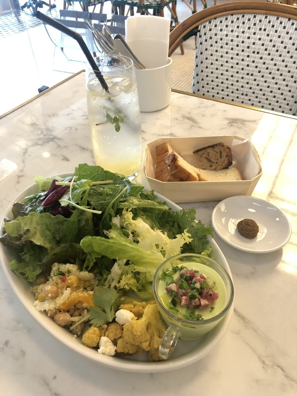 「日本で楽しめる本物のパリのおいしい日常をお届け」がコンセプトのお店、気になって、お友達と週末ランチに行きました。予約が出来ないということで、カフェオープン時間の11時頃行きました。店内にまだ空席は少しあって、すぐに席に案内してもらいました。ランチメニューは、野菜・肉・魚プレートから選べて、3種のデリ付き野菜プレートにしました(リベルテのパン3種類が食べ放題です)。久しぶりに会うお友達と、おしゃれな空間で、食材にこだわった美味しいランチが楽しめました。12時過ぎには、来店待ちの列が出来ていて、人気のお店のようでした。