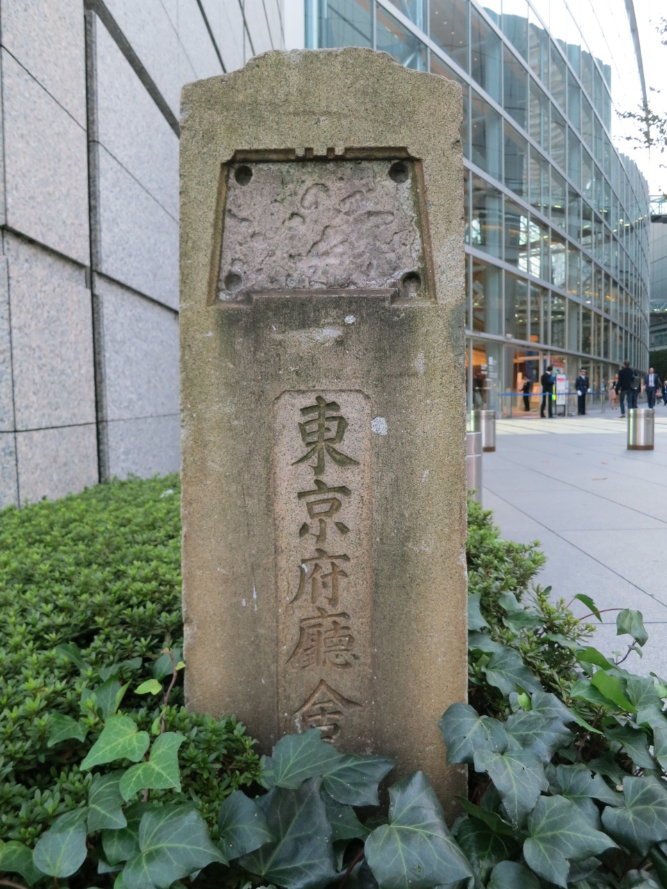 東京駅からキッテの前を通って東京国際フォーラムに向かい、「東京国際フォーラム東」の信号を渡って、東京国際フォーラムの敷地に入ったところに、東京府庁舎跡の石碑がひっそりと立っていました。ここに東京府庁舎があったことを告げる石碑です。1889年にこの地に東京府庁舎が建てられ、1998年には府庁舎内に東京市庁舎が開設されたそうです。その後、1943年に東京都庁舎となり、一旦は戦災で消失してしまうけれど、1957年に新しい新都庁舎が落成。その後都庁の新宿移転によって、解体され、跡地が東京国際フォーラムなどになったようです。この地の歴史を感じる石碑です。