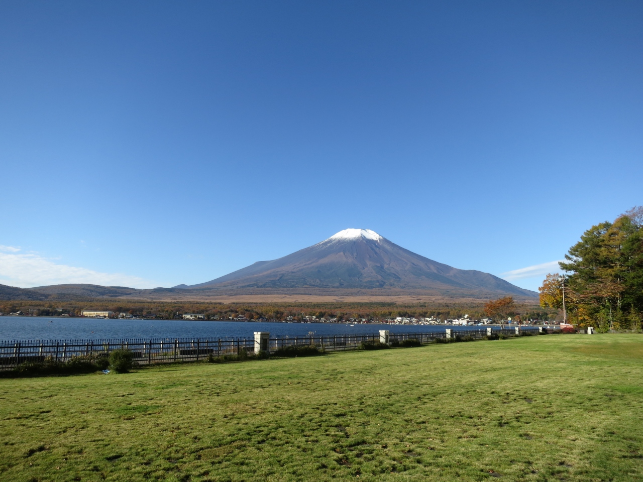 富士五湖で一番大きく標高が高い湖、そして富士山に一番近い湖です。湖畔には富士山のビュースポットが多く、南岸にはレストランやカフェ、ミュージアム、キャンプ場などが多くあります。湖畔にあるホテルに宿泊しましたが、到着日はあいにくの曇り空で、富士山は一部雲に隠れてきれいに見えませんでしたが、翌日は晴天でお部屋からも露天風呂からもレストランからも穏やかな山中湖と雄大な富士山が見え、最高でした。山中湖畔から見る富士山は、真近にあって雄大で大好きです。