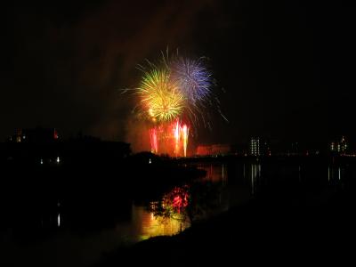 よさこい祭り前夜祭の日に例年開催される高知市納涼花火大会ですが、今年は台風接近のため、後夜祭翌日の13日に開催となり、ちょうど高知にいたので、家族で見に行きました。入場券が必要な共同観覧区域シート席(無料)や、立ち見区域(無料)が山内神社前にありますが、小さな子ども連れなので、あまりの人ごみは避けて、鏡川に架かる新月橋の上から観覧しました。新月橋は、歩道も広い橋なので、歩道や歩道部分にあるベンチに座って見るている人が沢山いましたが、混雑といったほどではありませんでした。少々遠いながらもナイアガラも見え、花火終了後もスムーズに帰ることが出来、親もストレスなく、花火を楽しむことが出来ました。高知を代表する花火大会の1つなので、開催日に高知にいれば、オススメです。筆山の山頂と中腹、鏡川河川敷から約4000発の花火が上がります。