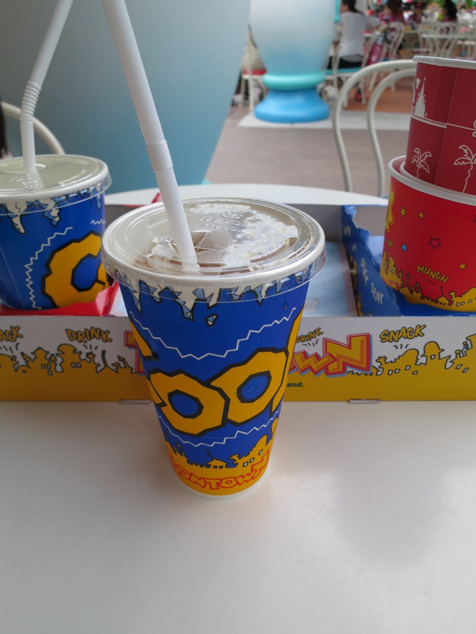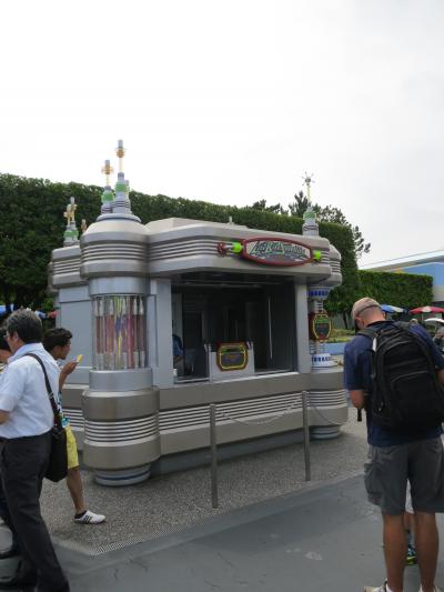 トゥモローランドの、『バズ・ライトイヤーのアストロブラスター』や『スター・ツアーズ』の近くにあるピザのお店です。イタリア人系宇宙人トニー・ソラローニ店長が迎えてくれるお店は、まるでアトラクションの1つのようです。家族が『ワンマンズ・ドリーム?』に並んでいる間に、こちらでダブルソーセージピザのドリンクセット¥980をテイクアウトしました。お昼少し前でしたが、お店は1列に数人並んでいるくらいで、あまり混んでいませんでした。『ワンマンズ・ドリーム?』に並びながら、炎天下の下でいただいたピザは、熱々で美味しかったです。ドリンクはスパークリングタピオカドリンク(レモン)にしましたが、こちらもとっても美味しくて、子どももよく飲みました。夏らしい見た目も涼しげなきれいなドリンクでした。