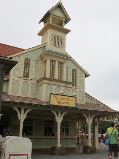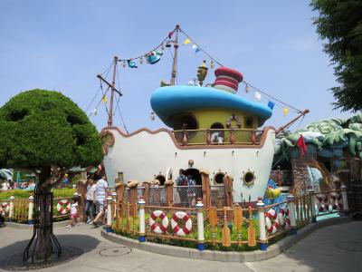 トゥーンタウンの『ミニーの家』の近くにある、ドナルドの甥っ子たちが開いたピザやドナルドバーガーのお店です。こちらで骨付きソーセージ¥330やフレンチフライポテト¥220、ドリンク(アップルティソーダ¥240、アップルジュース¥260など)を買って、トゥーンタウンの中央あたりにある屋根付の休憩エリア(テーブルとイスが沢山あります)で、休憩しながらいただきました。こちらのお店は、ドリンクが充実していて、子どもが好きなものもあり、夏の暑い日の水分補給にとてもよかったです。広い屋根付の休憩エリアは、暑い日でしたが、風が抜けて気持ちよく、よい休憩場所となりました。おやつ時でしたが、沢山の家族連れが休憩していました。