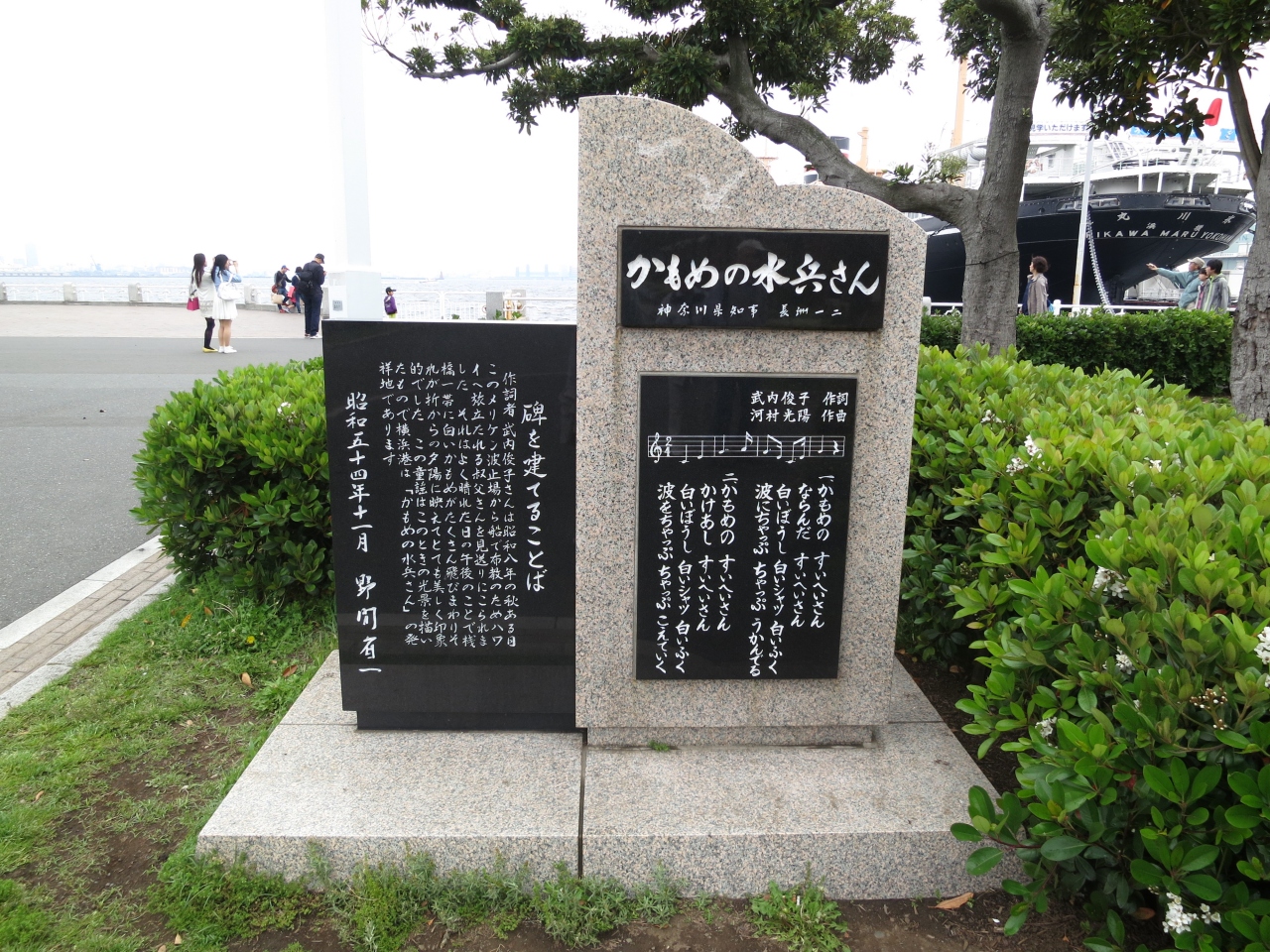 山下公園の氷川丸のすぐそば、沈床花壇の端に、「かもめの水兵さん」の歌碑と、その横に「碑を建てることば」を記した副碑が立っています。「かもめの水兵さん」の作詞者武内俊子さんは、昭和8年の秋、このメリケン波止場から船で布教のためハワイへ旅立たれる叔父さんを見送りに来、桟橋一帯に白いカモメが飛びまわる光景を見て、後日この歌を作ったそうです。横浜港は、「かもめの水兵さん」の発祥地ということが明記されていました。
