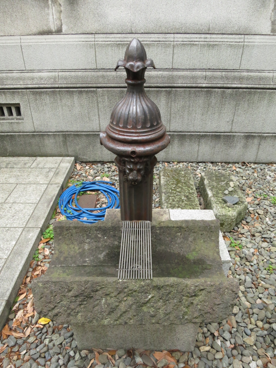 横浜開港資料館の中庭に屋外展示されています。共用栓は、日本最初の近代水道となった横浜水道創設時(明治18~20年)に市内各所に配置されていたもので、イギリス・グレンフィールド社から輸入されたものらしいです。また、水受石は、山手の坂道など居留地時代の道路側溝に使用されていた石材を再利用していたそうです。資料館に入館しなくても中庭は見学できるので、横浜散策の際に寄って見たい、横浜の歴史を感じられるスポットです。中庭には、江戸時代からここにあって、日米和親条約の締結は、この木の近くで行われたという通称「玉楠」と呼ばれているタブノキもあります。