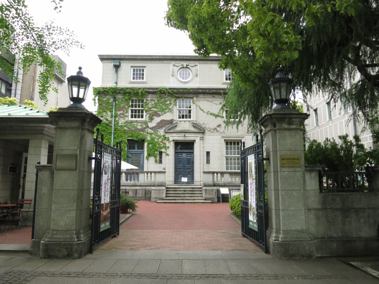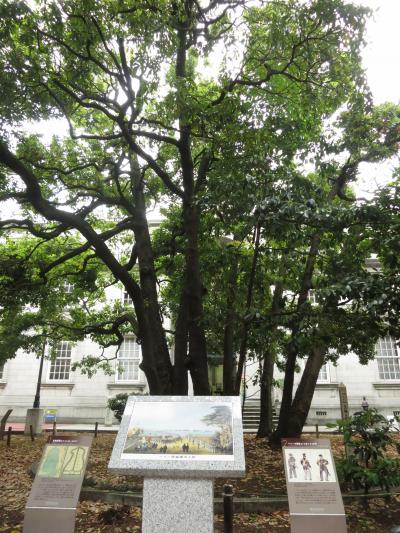 横浜開港資料館の中庭にある、江戸時代からここにあって、日米和親条約の締結は、この木の近くで行われたという通称「玉楠」と呼ばれているタブノキです。関東大震災によって幹の部分を消失したけれど、残った根から新たに芽が出て現在のものになったようです。資料館に入館しなくても、中庭は見学できるので、横浜散策の際には寄って見たい、横浜や日本の歴史を感じられるスポットです。中庭には、獅子頭共用栓とブラフ溝も展示されていました。