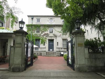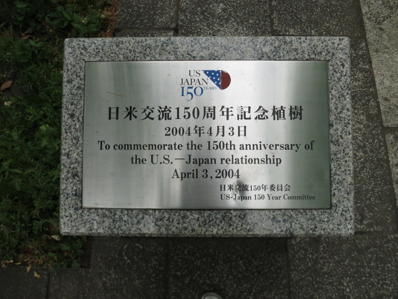 横浜開港資料館に隣接する開港広場の一角に「日米交流150周年記念植樹2004年4月3日」と書かれた記念碑があります。日米交流150周年記念式典が2004年4月3日にこの場所(開港広場)で行われ、その際にタフト大統領の曾孫であるボブタフトオハイオ州知事から送られたハナミズキがここに記念植樹されたようです。広場内には、「日米和親条約締結の地」の記念碑や「日米和親條約調印の地」と刻まれた球形の石碑があり、ここから日本とアメリカの交流がスタートしたことが伺えます。横浜散策の際には寄って見たい、横浜や日本の歴史を感じられるスポットです。広場では、その他、「旧居留地90番地の大砲」や「時計塔」、「明治10年代に築造されたレンガ造りマンホールと下水管」なども見ることができます。