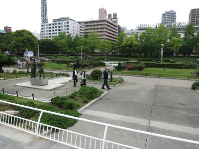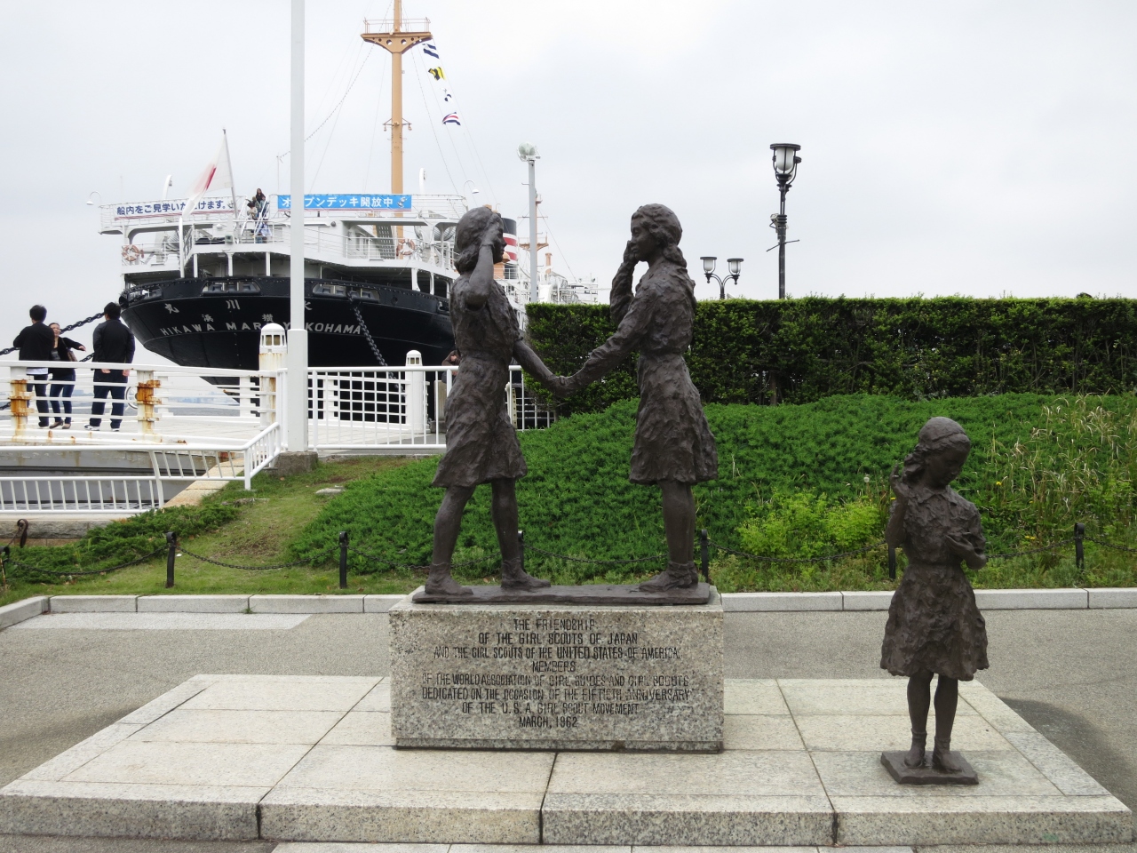 山下公園の氷川丸のそば、沈床花壇の一角に、3人の女の子の銅像が立っています。日米友好の記念として、アメリカガールスカウト50周年とガールスカウト本連盟の世界連携加入を記念して昭和37(1962)年に建てられたそうです。台座には「やくそく」と彫られていて、「ガールスカウトの友情」を示す像とされているそうです。背景には、氷川丸と海が見え、前には沈床花壇が広がり、最高のロケーションにある3人の女の子の銅像です。