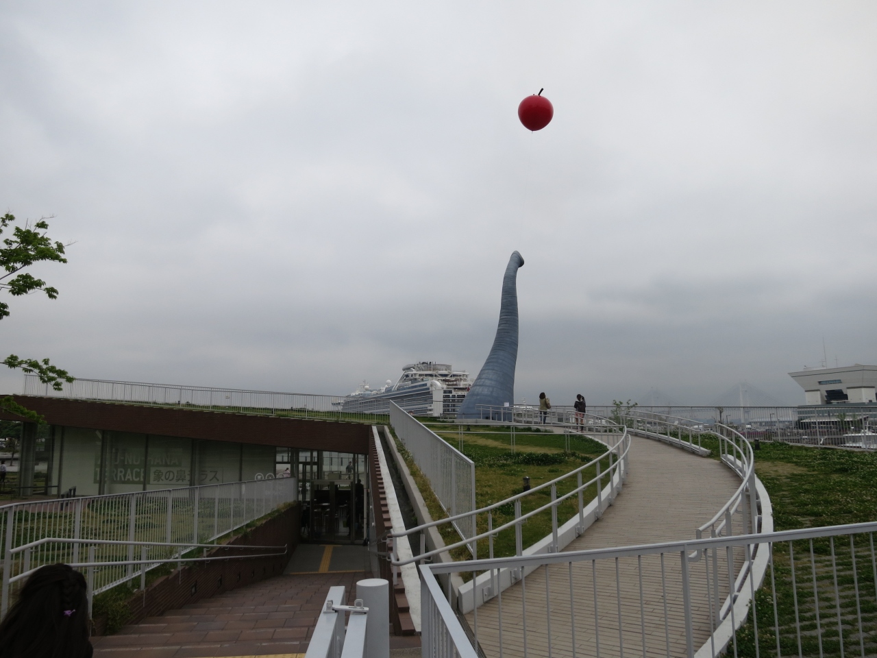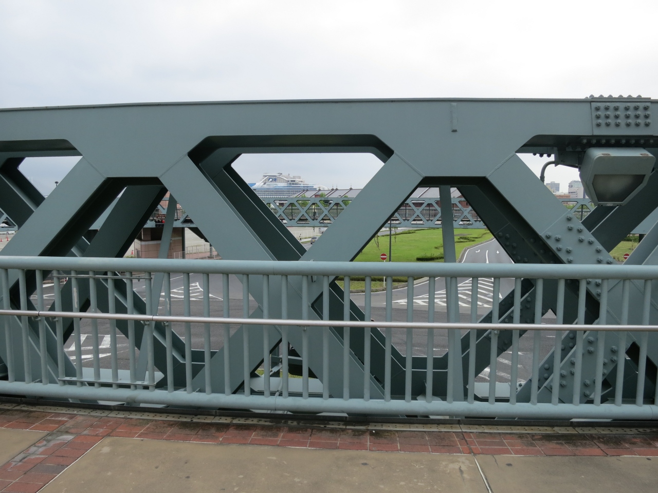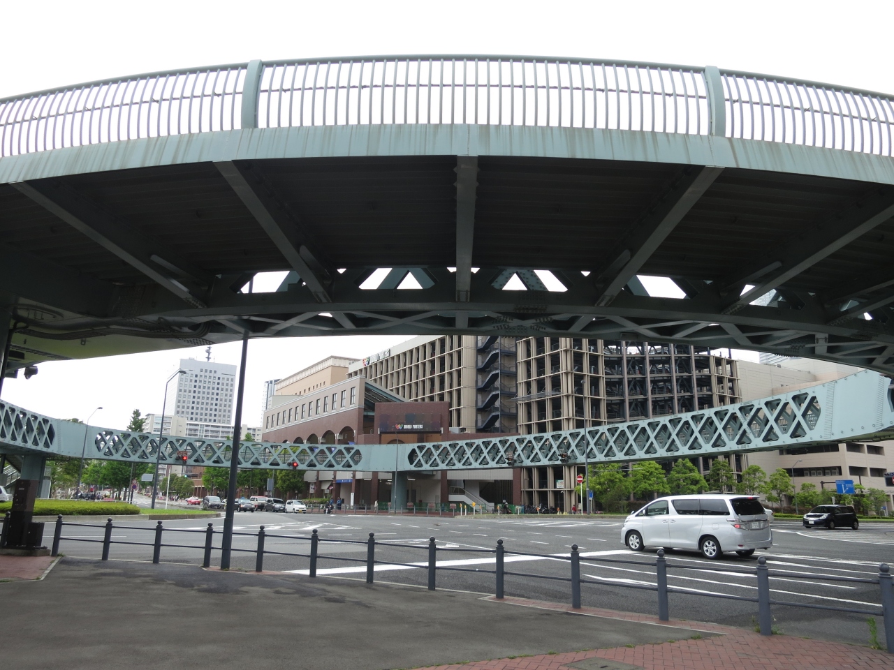 横浜ワールドポーターズ2Fからつながる、交差点の上にある円形の大きな歩道橋で、汽車道を通って、横浜ワールドポーターズを経由し、赤レンガ倉庫方面に行く際にいつも利用します。いつも通行人は少なく、子どもたちは下の道路を走る車を眺めたり、大さん橋に停泊する大型客船を眺めたり、お気に入りのスポットです。ベビーカーでも、エレベーターもあるので問題なく通れます。