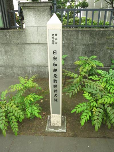 横浜開港資料館に隣接する開港広場に「日米和親條約調印の地」と刻まれた球形の石碑があります。また広場の一角には、「日米和親条約締結の地」の記念碑も立っていました。安政元(1854)年、日米の代表が横浜村の海岸で会見し、和親条約を結びました。これが、日本の開国を促し、横浜市の誕生の遠因にもなったそうです。歴史的舞台となった応接所は、現在の神奈川県庁付近だそうです。横浜散策の際には寄って見たい、横浜や日本の歴史を感じられるスポットです。広場内には、「日米和親条約締結の地」の記念碑の他、「旧居留地90番地の大砲」や、「日米交流150周年記念植樹」「時計塔」「明治10年代に築造されたレンガ造りマンホールと下水管」などもあります。