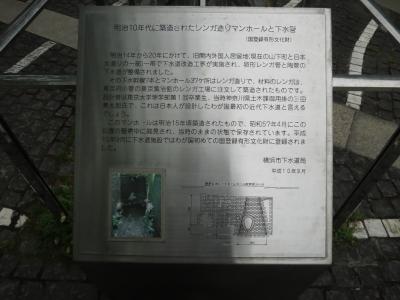 横浜開港資料館に隣接する開港広場のほぼ中央部にある、昭和57年にこの広場の整備中に発見された、明治10年代に築造されたレンガ造りのマンホールと下水管です。発見当時のままの状態で保存されていて、ガラス越しに地下に見ることが出来るようになっています(草が生い茂っていて、あまりよく見えなかったです)。平成10年に国登録有形文化財にも登録されています。明治14~20年にかけて、この辺りで下水道改造工事が実施され、それは日本人が設計した日本最初の近代下水道だったようです。横浜散策の際には寄って見たい、横浜や日本の歴史を感じられるスポットです。広場内には、「明治10年代に築造されたレンガ造りマンホールと下水管」の他、「日米和親条約締結の地」の記念碑や「旧居留地90番地の大砲」、「日米交流150周年記念植樹」「時計塔」なども見ることができます。