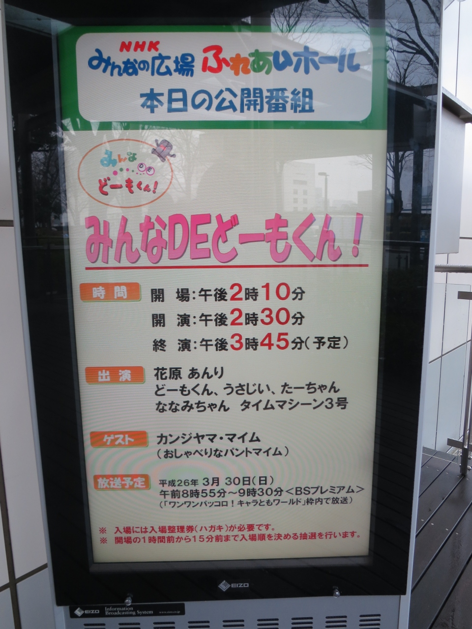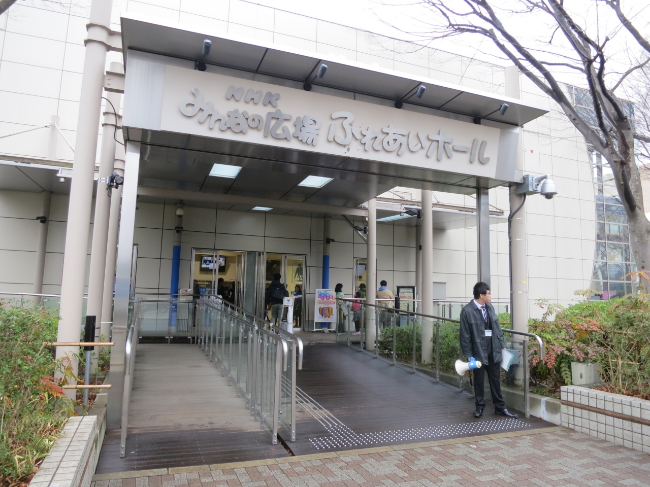 NHK放送センター内の「みんなの広場ふれあいホール」で行われる「みんなDEどーもくん!」の公開番組観覧に行きました。子どもも一緒で、お天気もよくなかったので、車で行きました。ちょうどこの辺りの地下が「渋谷区役所前駐車場」になっていて、こちらに駐車しました。階段を上ると、NHK放送センターの脇に出られて、とても便利でした。「みんなの広場ふれあいホール」へは、歩行者出入口13が最寄りです。公開番組観覧後は、行ったことのなかった「スタジオパーク」にも寄りました。こちらは、歩行者出入口10が最寄りです。24時間営業、650台収容可能の地下駐車場でオススメです。
