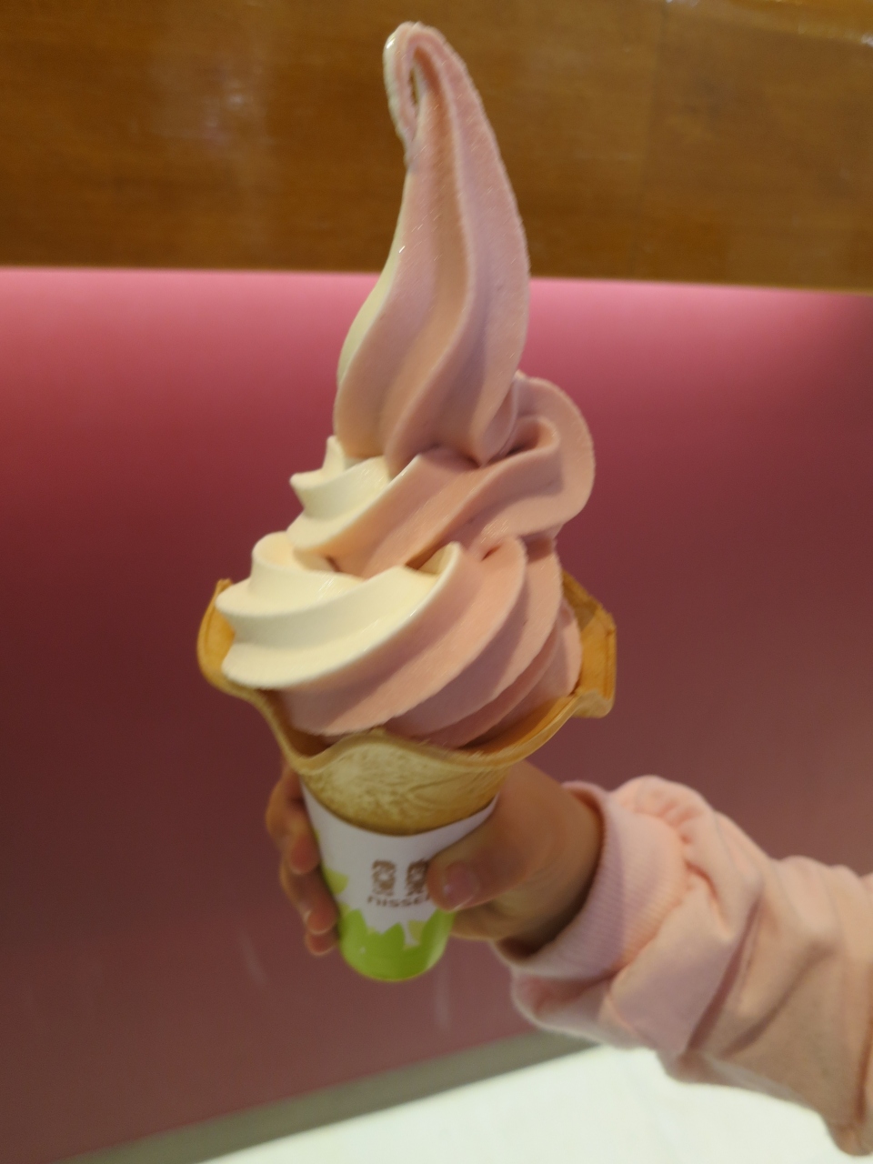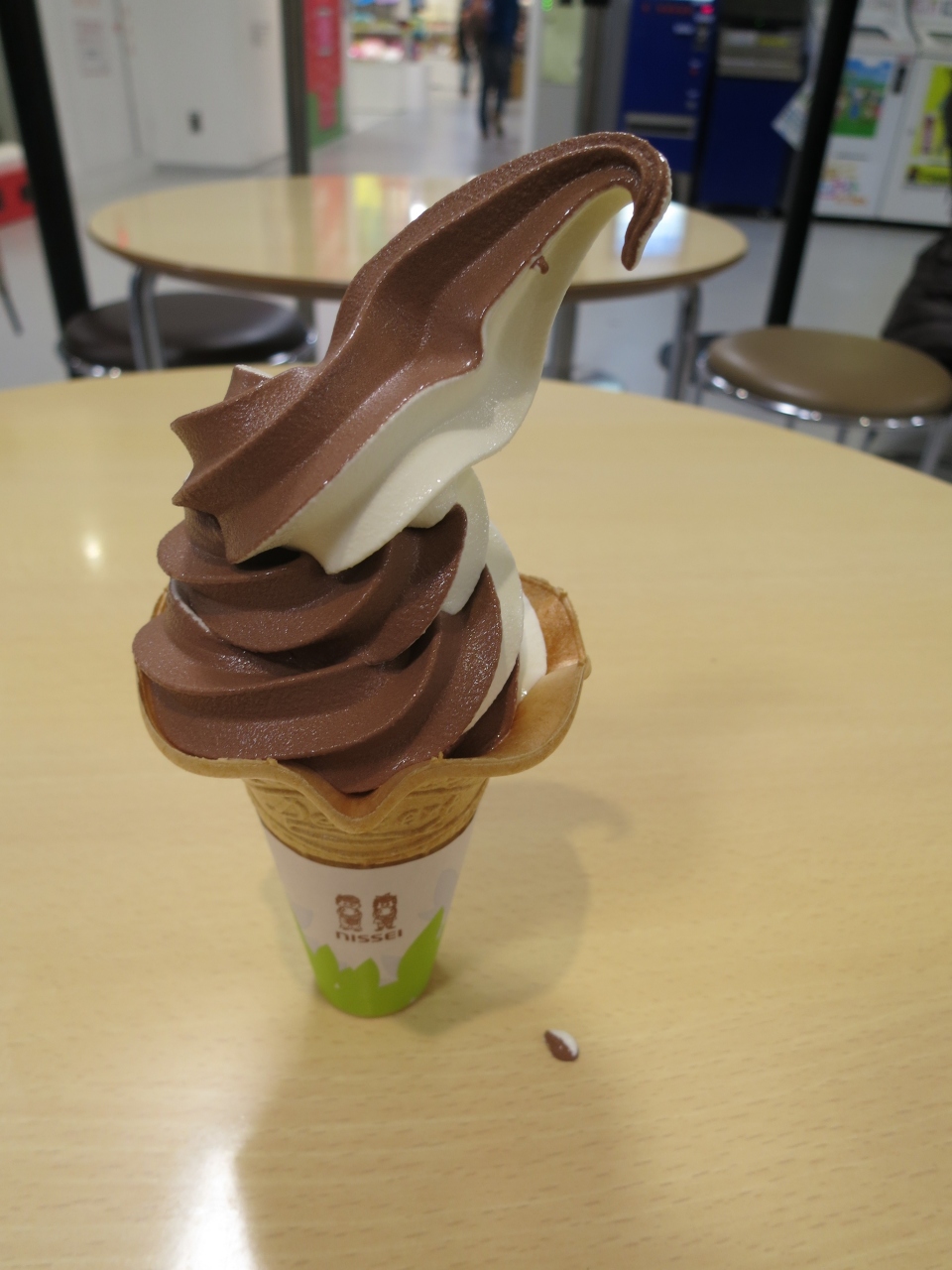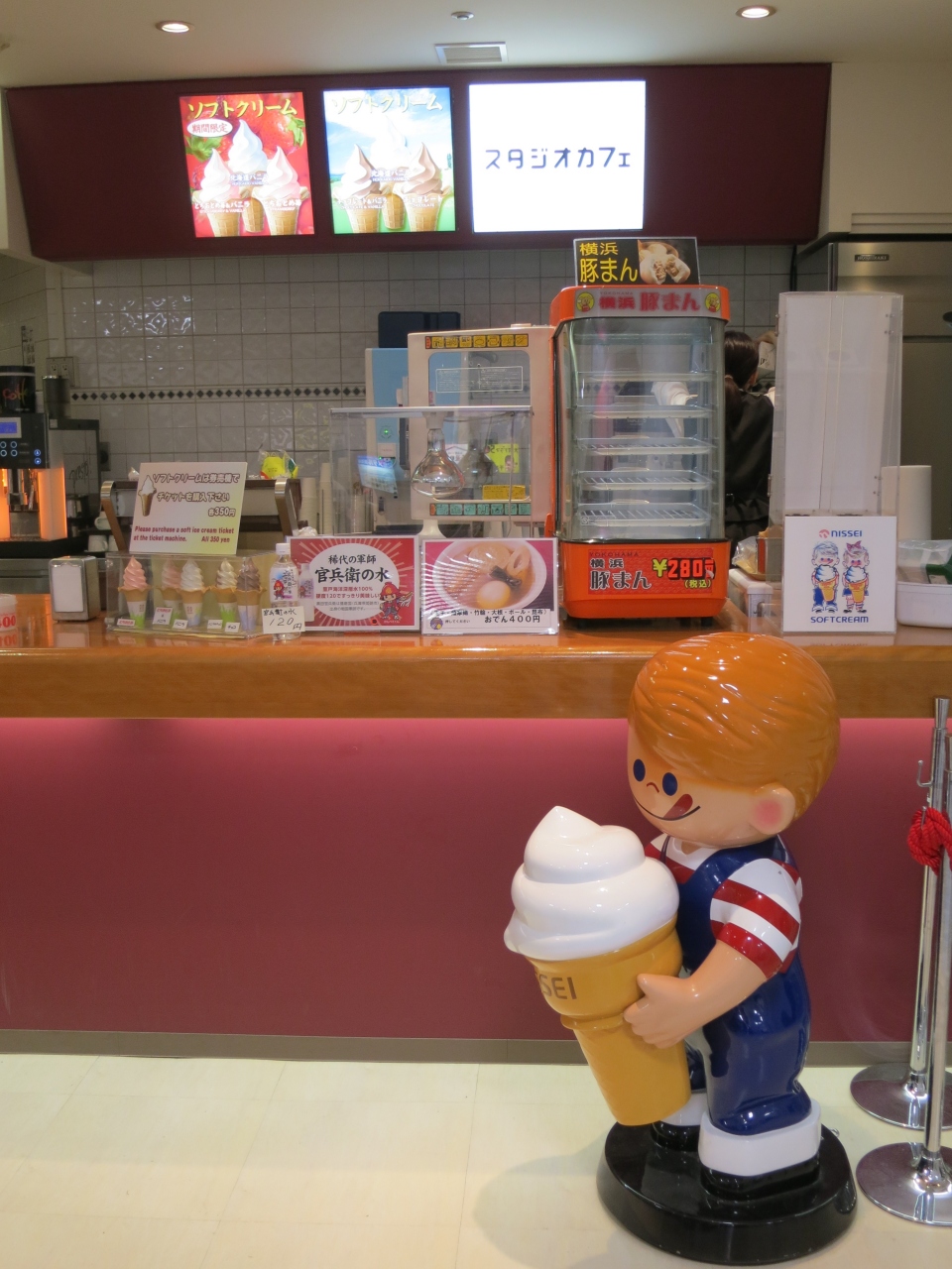 「みんなDEどーもくん!」の公開番組観覧後、行ったことのなかったスタジオパークを家族でゆっくり見学し、その後出口手前にあったスタジオカフェで休憩しました。ソフトクリームが大好きな娘のリクエストで、苺とバニラのミックスとチョコレートとバニラのミックスのソフトクリーム(ともに¥350)をいただきました。どちらも濃厚で美味しかったです。豚まんやたこ焼き、おでんなどもあり、スタジオパーク見学後の休憩にオススメの食券制のカフェです。隣には、お食事のできるレストランスペースもありました。