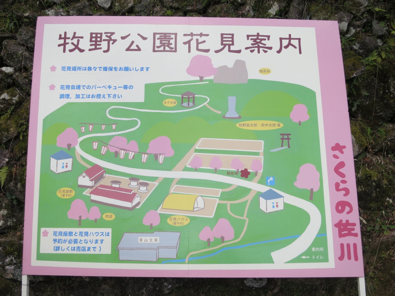 植物学者牧野富太郎が東京染井で見つけた桜ソメイヨシノの苗を送って来たのを、青源寺の土手などに植えたことが始まりで、今では高知を代表する桜の名所の1つです。日本の桜名所100選にも選ばれています。公園内、中腹には牧野富太郎と田中光顕の分骨墓もあります。桜の時期には、ぼんぼりが付き、公園のある山は桃色に色づき、大変美しい春の風景です。お花見の時期には、花見ハウスや花見座敷(共に要予約)もオープンします。公園の頂上には、物見岩があり、桜とともに、佐川の街を見渡せます。岩を利用した滑り台もあり、子どもたちに人気です。桜の時期にぜひ行きたい、お花見スポットです。