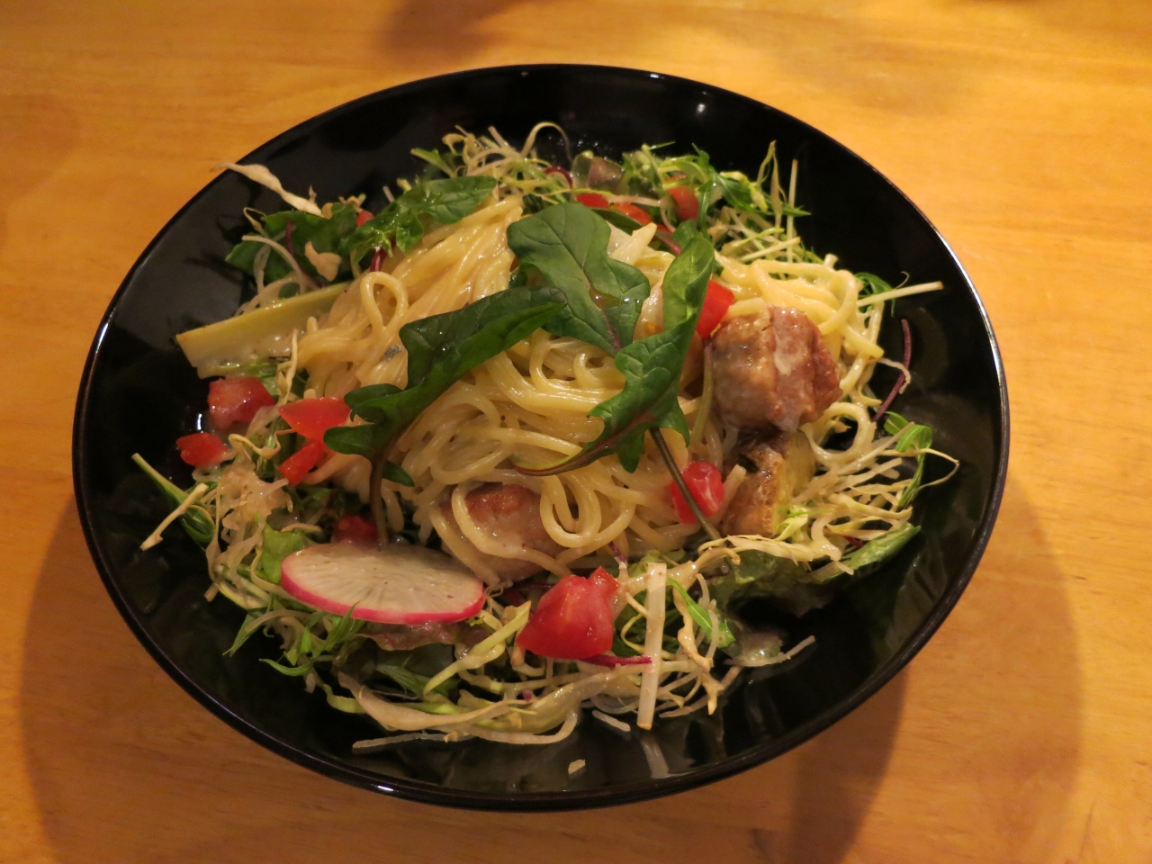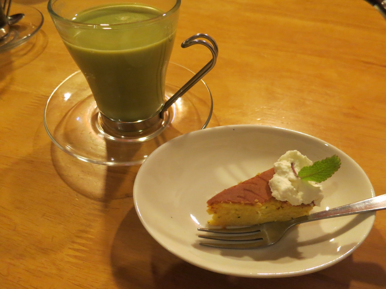 野菜が主役の生パスタランチ(ドリンク&ハーフデザート付き)¥1300から、「ほうれん草の生フィットチーネ・炙りサーモンとアボカドのクリームソース」と、「本日の生パスタ(肉団子のゴルゴンゾーラソース)」を、ともに大盛り(+¥200)でいただきました。日本野菜ソムリエ協会認定のレストランというだけあって、どちらも野菜がふんだんに使われていて、目にも鮮やかなパスタでした。新鮮でしっかり甘みが感じられる野菜が多種類使われていて美味しく、山盛りの野菜&パスタでしたが、子どもたちとあっという間に完食しました。どちらのパスタも、野菜の味を活かしつつ、野菜が好きじゃなくても、食が進むソースのように感じました。食後には、「豆乳抹茶オレ(ホット)」と今日のデザートの「栗カボチャのチーズケーキ」をいただきました。チーズケーキは、想像以上にしっかりチーズケーキで、とても美味しく、他の野菜を使ったデザートも今度食べてみたいと思いました。外食でも、美味しいお野菜がたっぷりいただけて、満足満腹なランチでした。