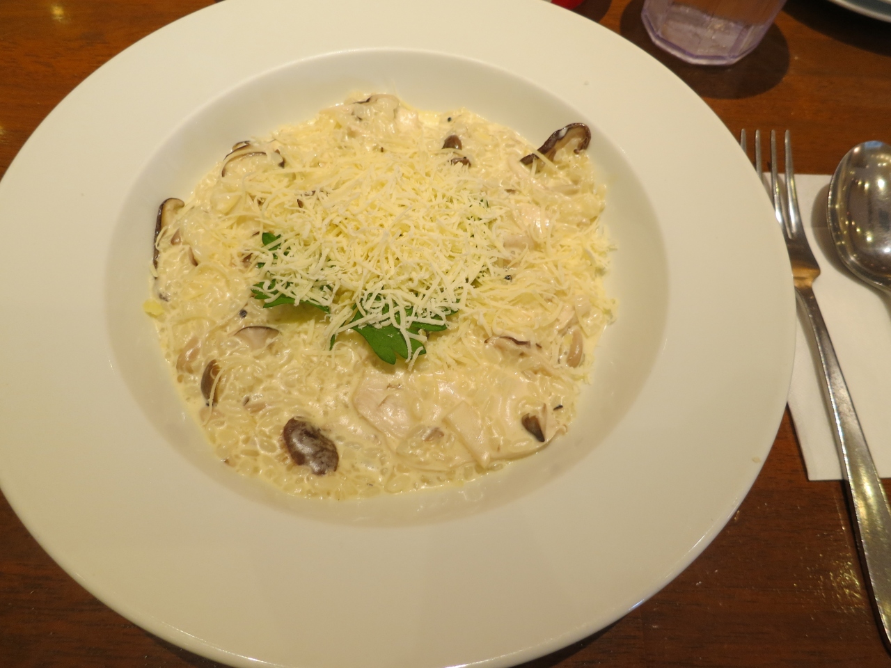 御殿場プレミアムアウトレットでお買い物中のランチに寄りました。朝からお買い物をしていたので、ゆっくり店内で座ってお食事が出来るお店に行きたいと思い、こちらにしました。土曜日の13時過ぎでしたが、ほぼ並ぶことなく、入店出来ました。注文したのは、チキンとキノコのクリームリゾット¥1280とたらこクリームパスタ¥1080です。11月下旬で外は寒かったのですが、温かいお食事をして、すっかり体も温まりました。どちらもとても美味しかったです。