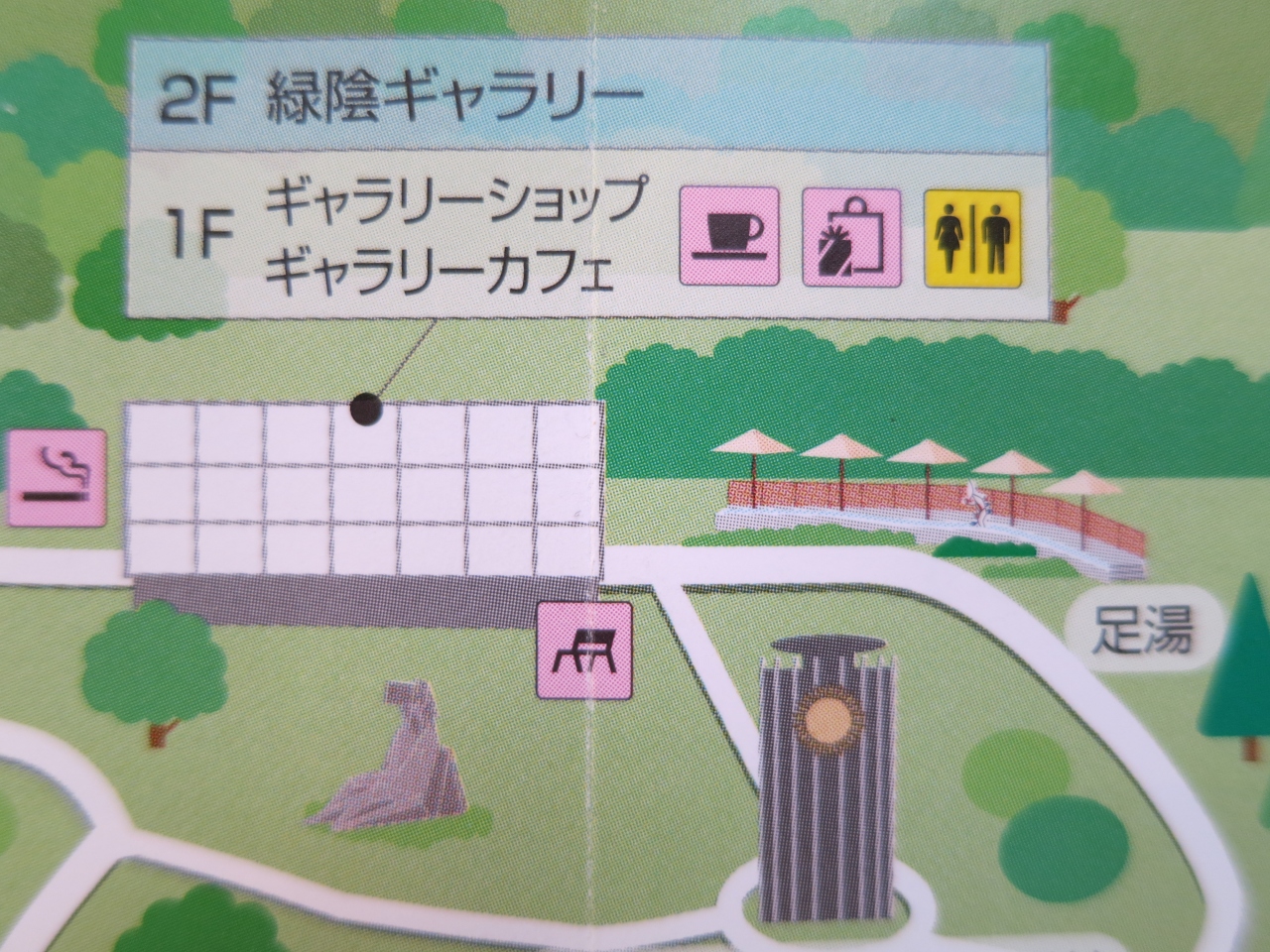 以前は絵画館と呼ばれていた建物は、現在は1階がギャラリーショップとギャラリーカフェ(これは以前と一緒です)、2階が緑陰ギャラリーとなっていて、パンフレットなどから「絵画館」という名称は消えています。緑陰ギャラリーには、彫刻作品が展示されています。夫と長女が、建物隣にある足湯に行っている間に、次女とギャラリーカフェでゆっくりしていましたが、外の緑やアートを見ながら温かい室内でゆっくりできて、とてもよい空間でした。- 旅行時期