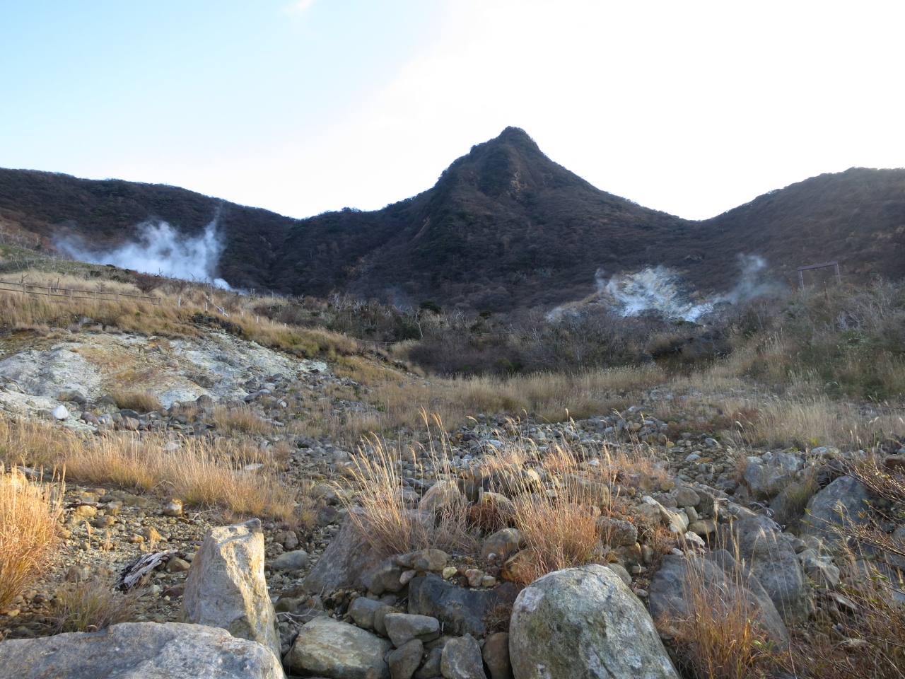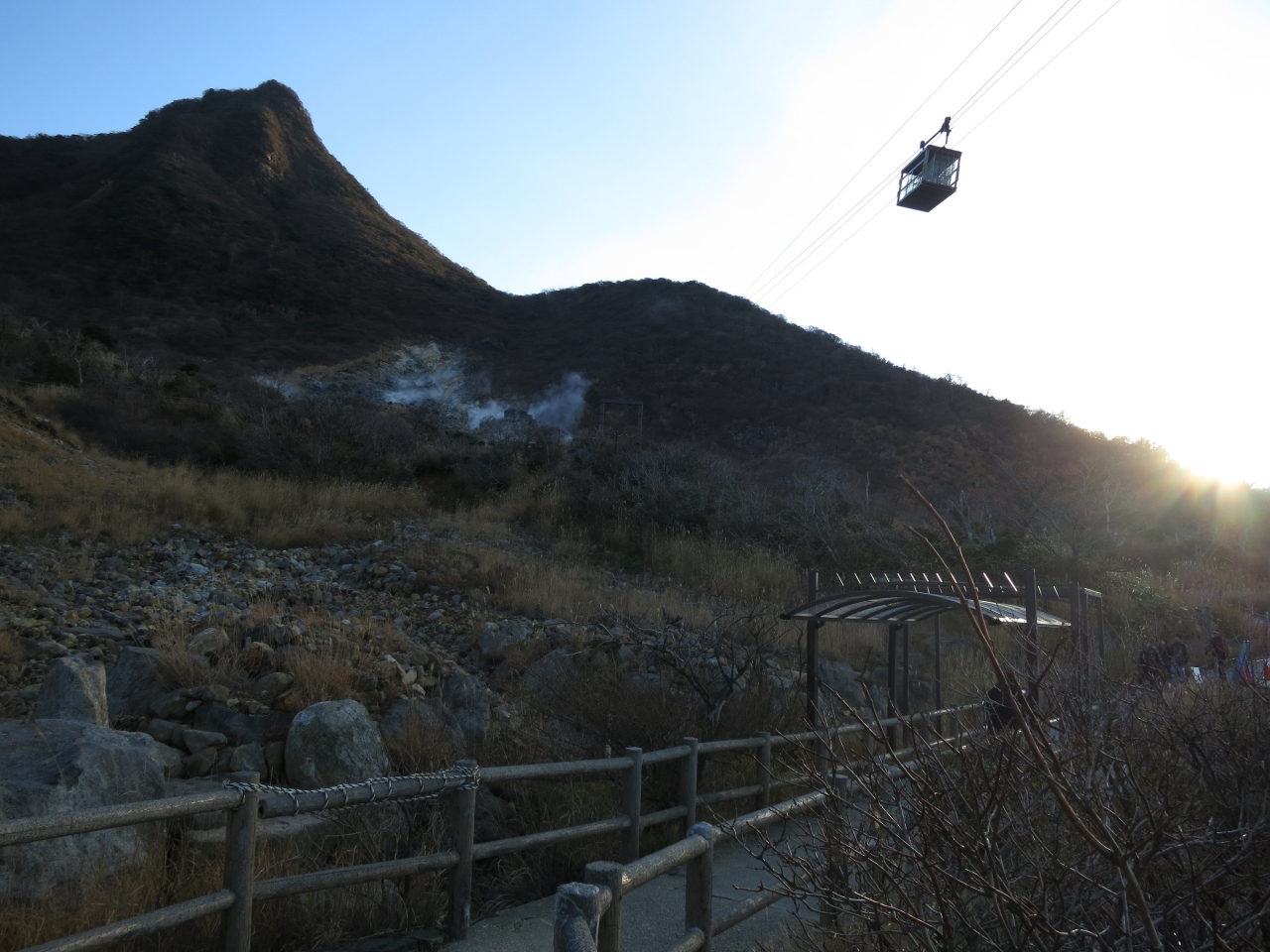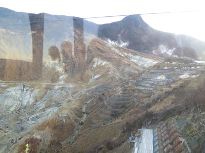 11月下旬の15時頃行きましたが、この日は風が強く、晴天でしたが気温は2℃くらいでとてもとても寒かったです。噴煙地まで行ける散歩道には、人はあまりいませんでした。せっかく来たので、購入した大涌谷名物の『黒たまご』をほっかいろがわりに、軽めに散策しました。硫黄のにおいがしだいに強くなり、噴煙も見え、現在も火山活動が続いている場所だということを体感することが出来ました。頭上を『黒たまご』が専用ロープウェイで運ばれているのが印象的でした。