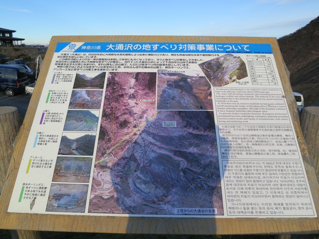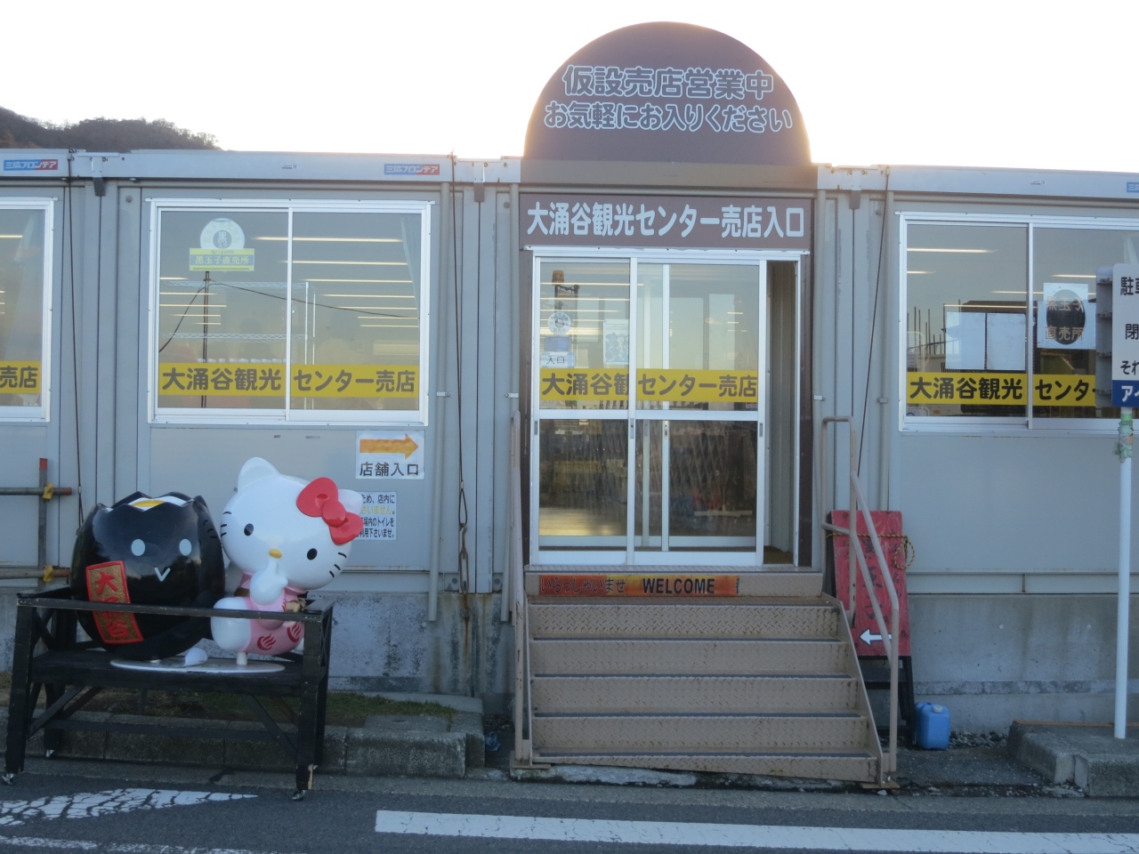 大涌谷観光センターは、建て替え工事中で、仮設店舗で営業していました。大涌谷では、観光センターの建て替え工事と大涌沢の地すべり工事が行われていて、駅前は観光地というより、工事現場のような雰囲気になっていました。観光センターは、2014年1月に『大涌谷くろたまご館』としてリニューアルオープンするらしいです。館内には、箱根ジオミュージアムやレストランも併設されるようなので、また次に行くときの楽しみにしたいです。