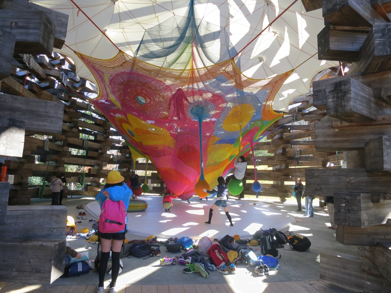 室内のアートホールは、1歳になったばかりの次女もよちよち歩きながら作品に触れて遊べ、幼児連れの家族に人気の場所となっていました。3歳の長女は、アートホールの他、しゃぼん玉のお城、ネットの森、足湯などを気に入ったようでした。