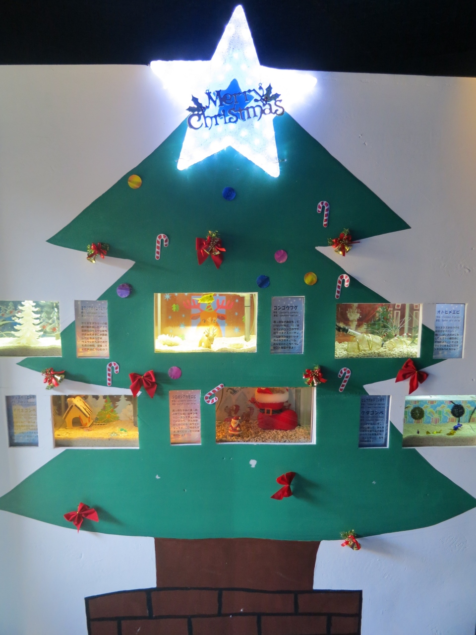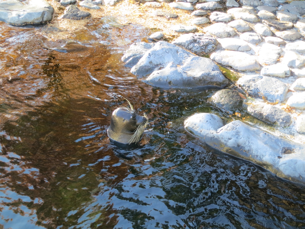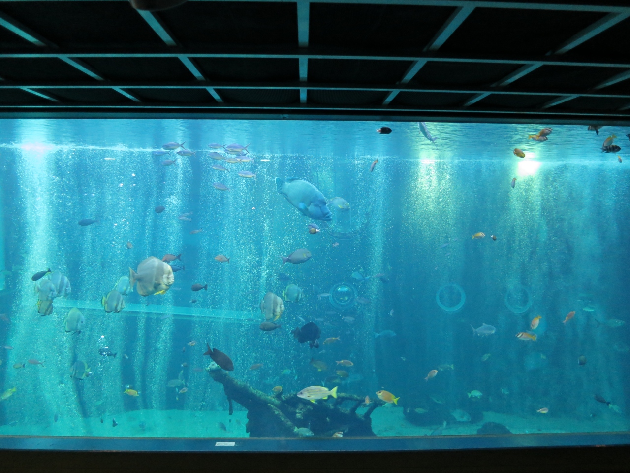 クリスマスの飾りを施した館内をゆっくりと観賞し、バイカルアザラシが6匹もいる日本では珍しい大きな大きな水槽の前で、しばらく足を止めて、バイカルアザラシたちがじゃれあって泳ぐ様子を観賞しました。まるっとしたかわいらしい体形に、愛嬌のあるお顔で、3歳の娘も飽きることなくしばらく見ていました。一通り館内を見た後は、再び海水館の中央にある高さ7m、海水1255tのオープンエアーの巨大水槽に戻り、入口横にある観覧席に座って、200種2万匹の魚たちが太陽光を浴びて泳ぐ姿をゆっくり観賞して、その後水族館を後にしました。この大水槽は、沈没船も置かれていて、まるで水の中にいるかのような気分にさせてくれるとても美しい水槽です。