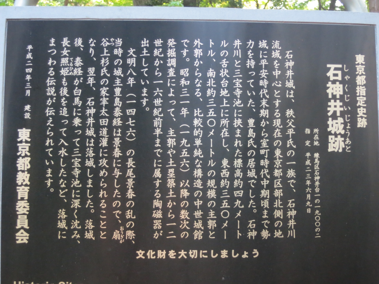 石神井城跡は東京都指定の史跡で、中世武士豊島氏の城館であった石神井城は、鎌倉時代中期から末期頃の築城と考えられ、文明9年(1477年)豊島勘解由左衛門尉が城主の時に太田道灌によって攻め落とされ、以後は廃城となったようです。