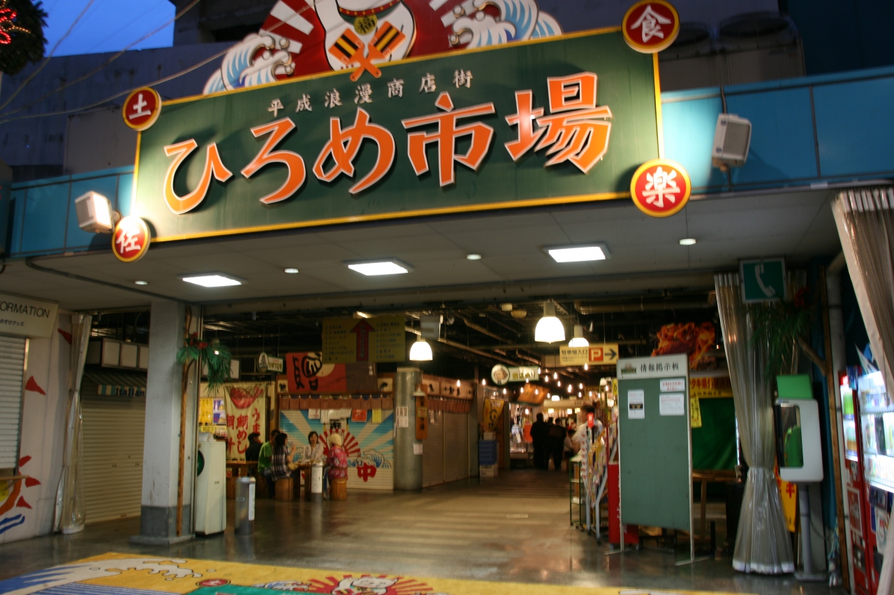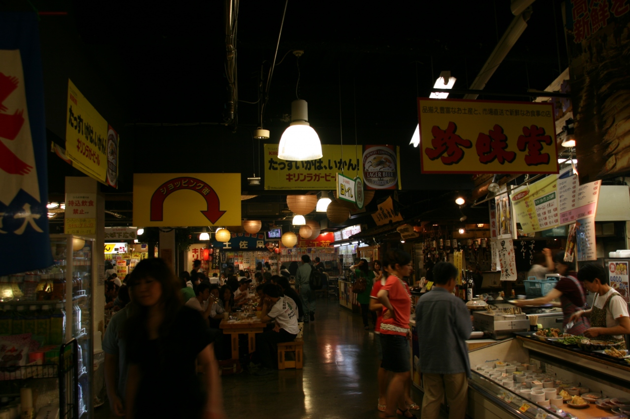 帯屋町商店街と大橋通り商店街の先にある巨大屋台村(屋内)です。飲食店約40軒、お土産店約20軒ほどあり、高知の名物がだいたい揃っています。フードコートのような感じで、好きなお店から好きなものを購入して来て、飲み食いできるので、地元の人も集まってお酒を飲んでいる人気の場所です。高知らしい雰囲気の場所なので、高知を感じに行くのにもオススメです。